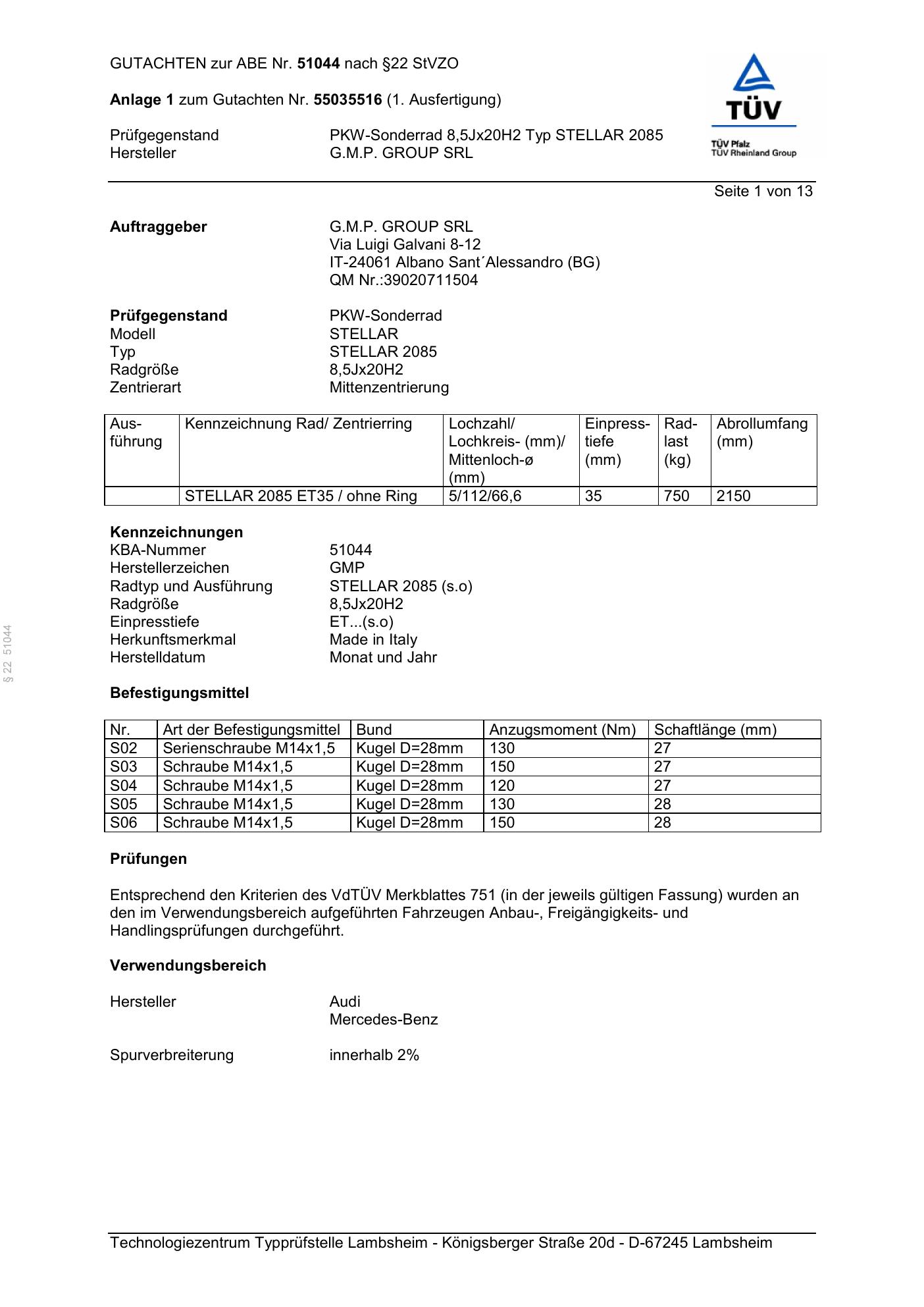 Dieses Gutachten (abe) bezieht sich auf die Alufelge G.M.P. STELLAR in der Ausführung ET 0, Mittenloch 0 mm (KBA 51044). Im PDF findest du typischerweise zulässige Reifengrößen, Auflagen/Anbauhinweise und – je nach Dokument – Hinweise zur Eintragung.