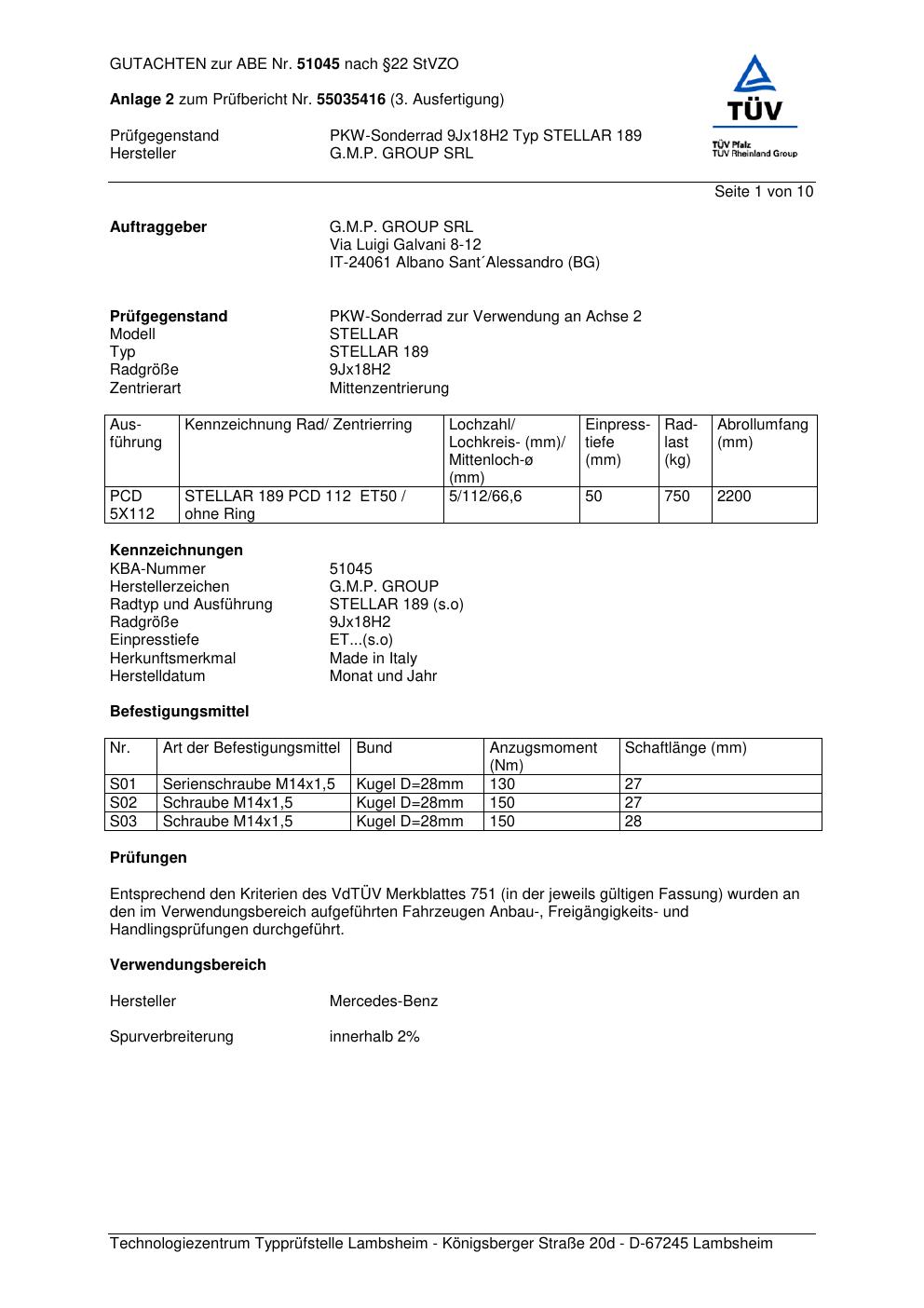 Dieses Gutachten (abe) bezieht sich auf die Alufelge G.M.P. STELLAR 18 9 in der Ausführung ET 0, Mittenloch 0 mm (KBA 51045). Im PDF findest du typischerweise zulässige Reifengrößen, Auflagen/Anbauhinweise und – je nach Dokument – Hinweise zur Eintragung.