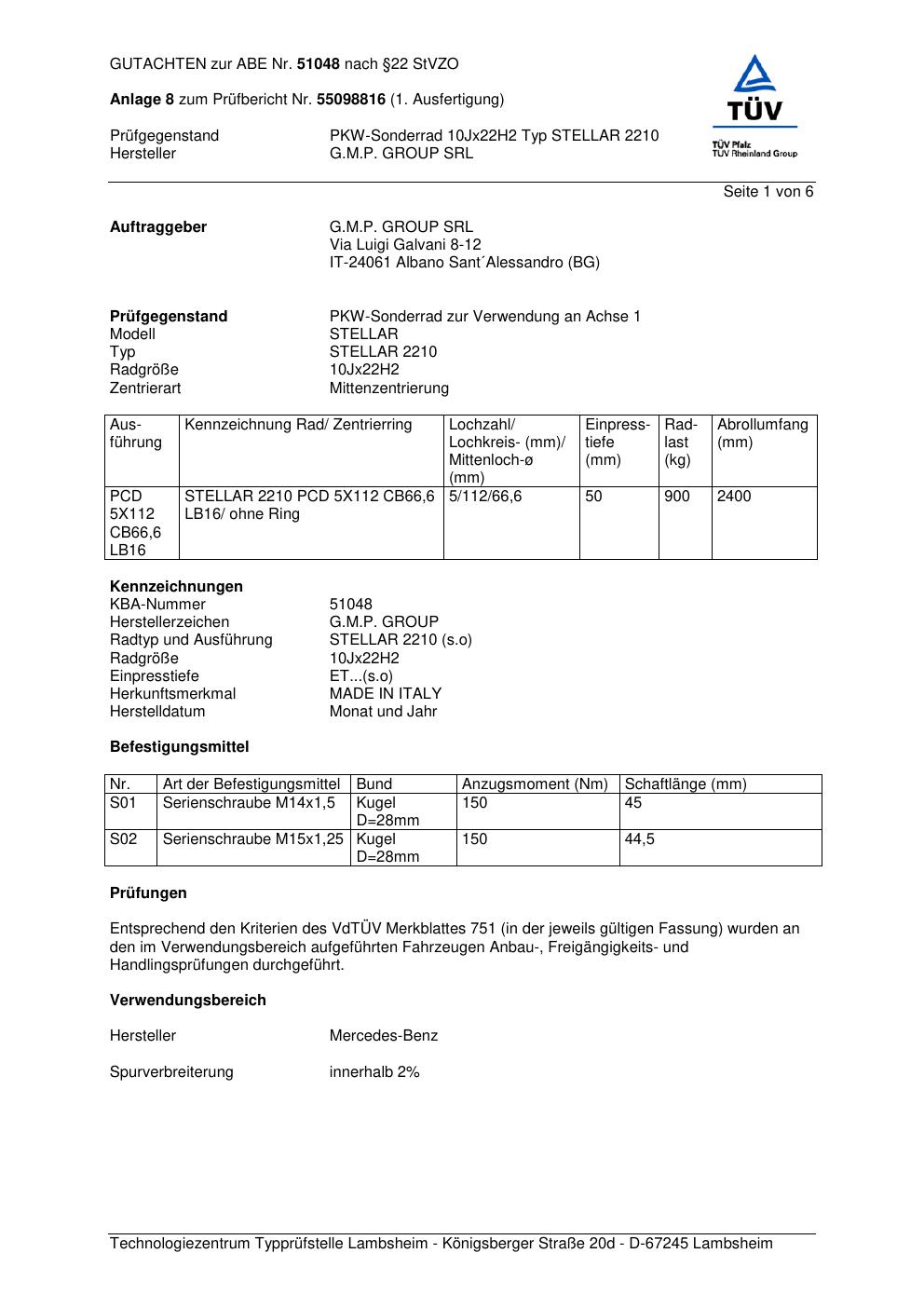 Dieses Gutachten (abe) bezieht sich auf die Alufelge G.M.P. STELLAR 2 210 in der Ausführung ET 0, Mittenloch 0 mm (KBA 51048). Im PDF findest du typischerweise zulässige Reifengrößen, Auflagen/Anbauhinweise und – je nach Dokument – Hinweise zur Eintragung.