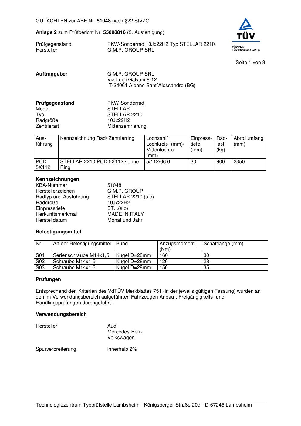 Felgengutachten / abe für Alufelgen G.M.P. STELLAR 2 210 (ET 0, Mittenloch 0 mm) mit KBA 51048 (Zertifikatsnummer 51048). Hier kostenlos als PDF herunterladen. Der Download-Link ist 24 Stunden gültig und kann bis zu zwei Mal verwendet werden.