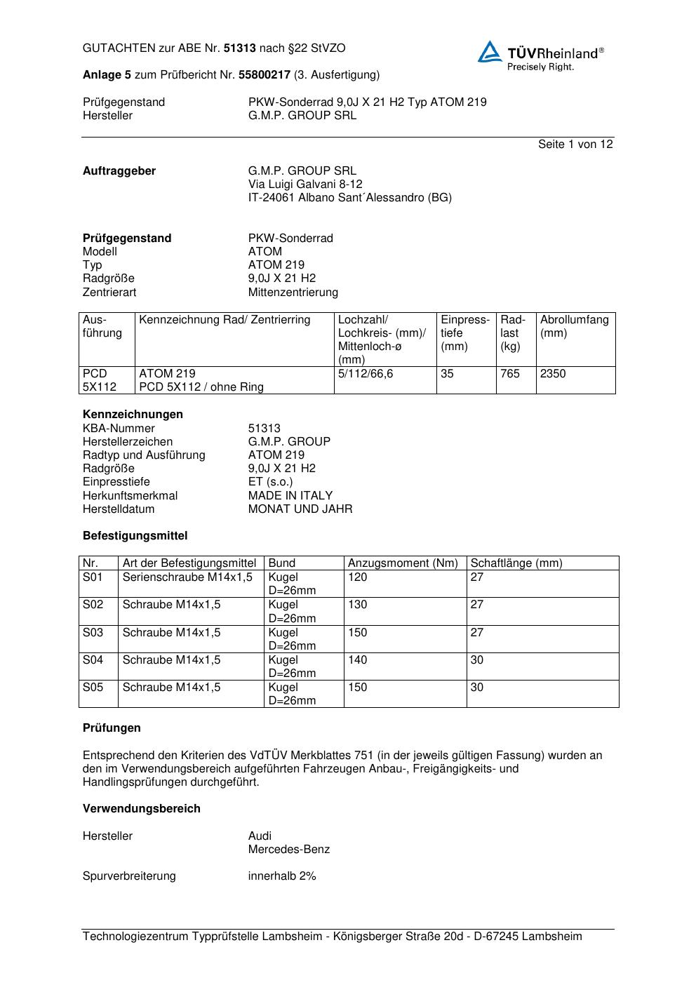 Felgengutachten / abe für Alufelgen G.M.P. ATOM 219 (ET 0, Mittenloch 0 mm) mit KBA 51313 (Zertifikatsnummer 51313). Hier kostenlos als PDF herunterladen. Der Download-Link ist 24 Stunden gültig und kann bis zu zwei Mal verwendet werden.
