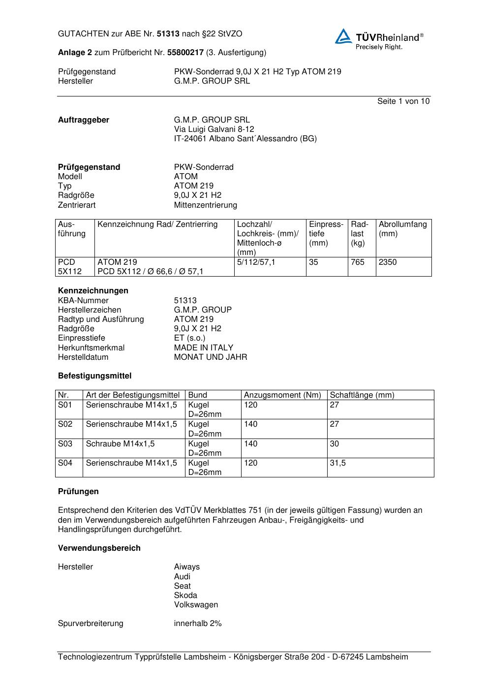Felgengutachten / abe für Alufelgen G.M.P. ATOM 219 (ET 0, Mittenloch 0 mm) mit KBA 51313 (Zertifikatsnummer 51313). Hier kostenlos als PDF herunterladen. Der Download-Link ist 24 Stunden gültig und kann bis zu zwei Mal verwendet werden.