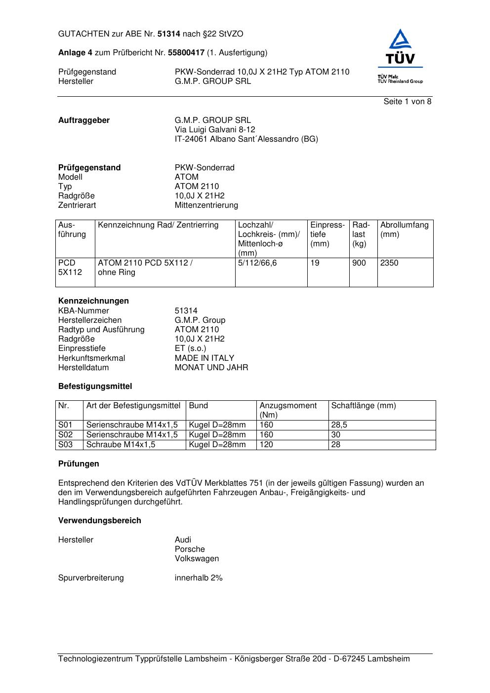 Felgengutachten / abe für Alufelgen G.M.P. ATOM 2110 (ET 0, Mittenloch 0 mm) mit KBA 51314 (Zertifikatsnummer 51314). Hier kostenlos als PDF herunterladen. Der Download-Link ist 24 Stunden gültig und kann bis zu zwei Mal verwendet werden.