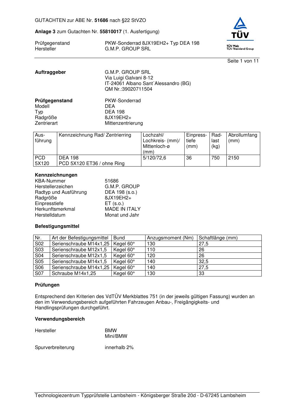 Dieses Gutachten (abe) bezieht sich auf die Alufelge G.M.P. DEA 198 in der Ausführung ET 0, Mittenloch 0 mm (KBA 51686). Im PDF findest du typischerweise zulässige Reifengrößen, Auflagen/Anbauhinweise und – je nach Dokument – Hinweise zur Eintragung.