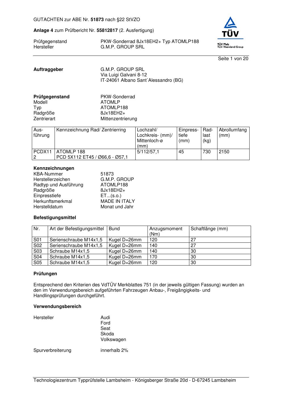 Felgengutachten / abe für Alufelgen G.M.P. ATOMLP18 8 (ET 0, Mittenloch 0 mm) mit KBA 51873 (Zertifikatsnummer 51873). Hier kostenlos als PDF herunterladen. Der Download-Link ist 24 Stunden gültig und kann bis zu zwei Mal verwendet werden.