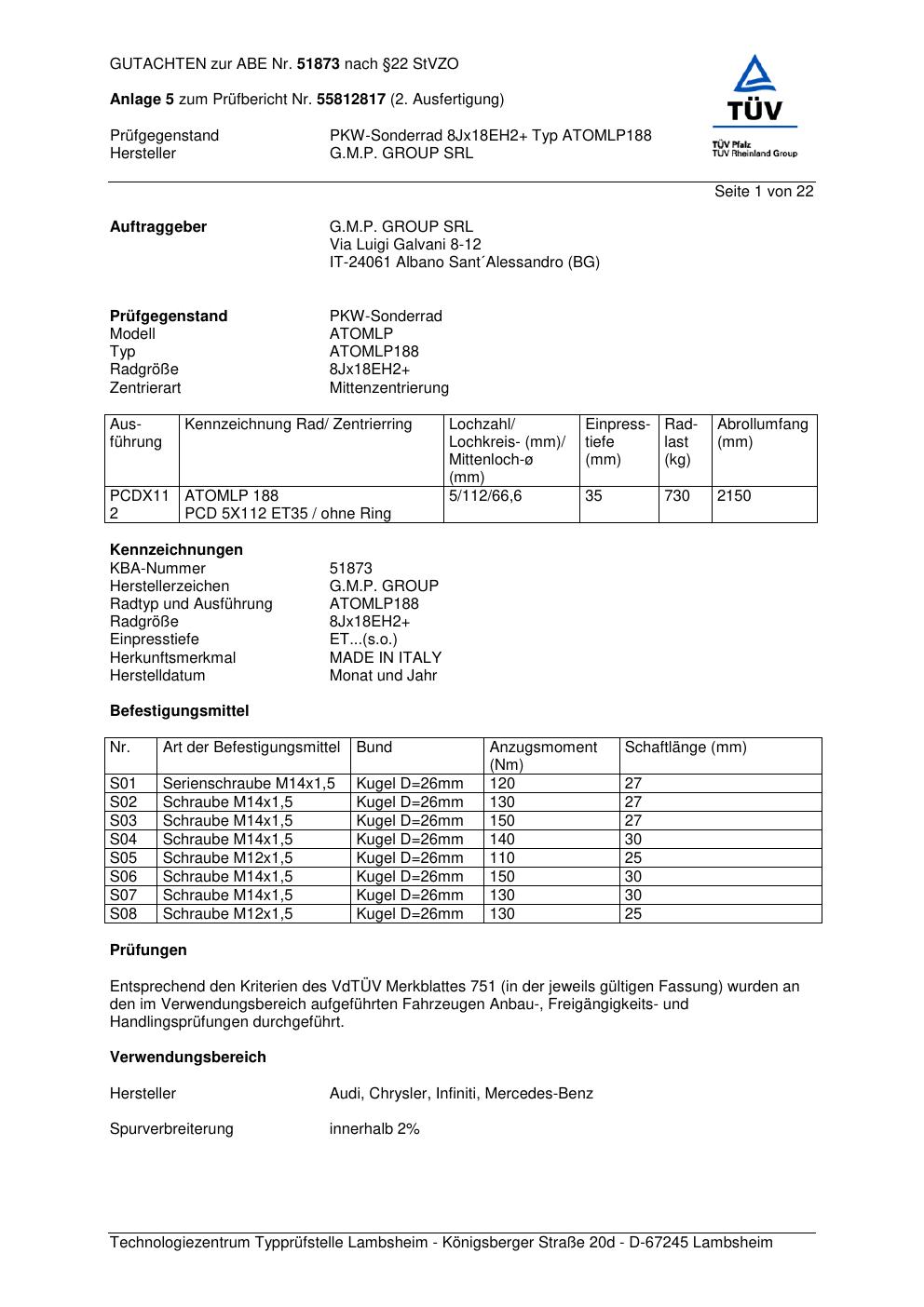 Dieses Gutachten (abe) bezieht sich auf die Alufelge G.M.P. ATOMLP188 in der Ausführung ET 0, Mittenloch 0 mm (KBA 51873). Im PDF findest du typischerweise zulässige Reifengrößen, Auflagen/Anbauhinweise und – je nach Dokument – Hinweise zur Eintragung.
