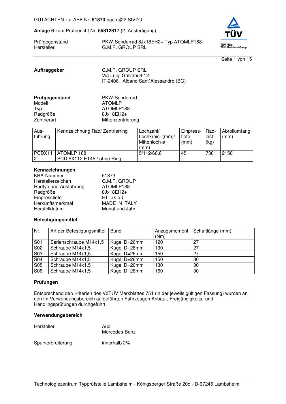 Felgengutachten / abe für Alufelgen G.M.P. ATOMLP18 8 (ET 0, Mittenloch 0 mm) mit KBA 51873 (Zertifikatsnummer 51873). Hier kostenlos als PDF herunterladen. Der Download-Link ist 24 Stunden gültig und kann bis zu zwei Mal verwendet werden.