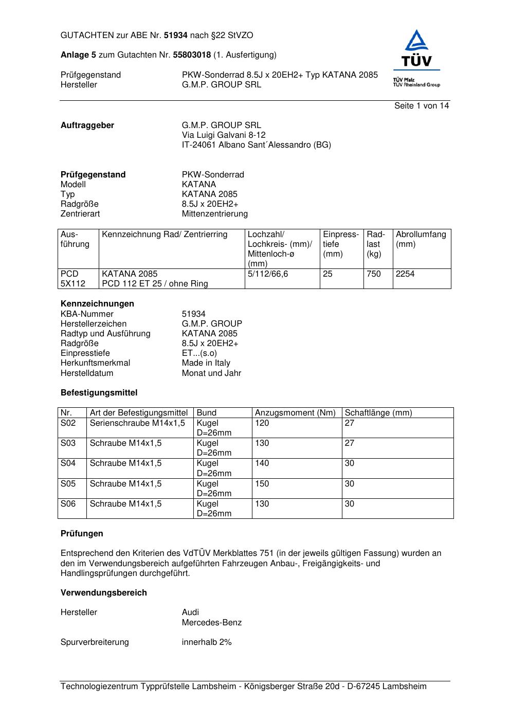 Dieses Gutachten (abe) bezieht sich auf die Alufelge G.M.P. KATANA 2085 in der Ausführung ET 0, Mittenloch 0 mm (KBA 51934). Im PDF findest du typischerweise zulässige Reifengrößen, Auflagen/Anbauhinweise und – je nach Dokument – Hinweise zur Eintragung.