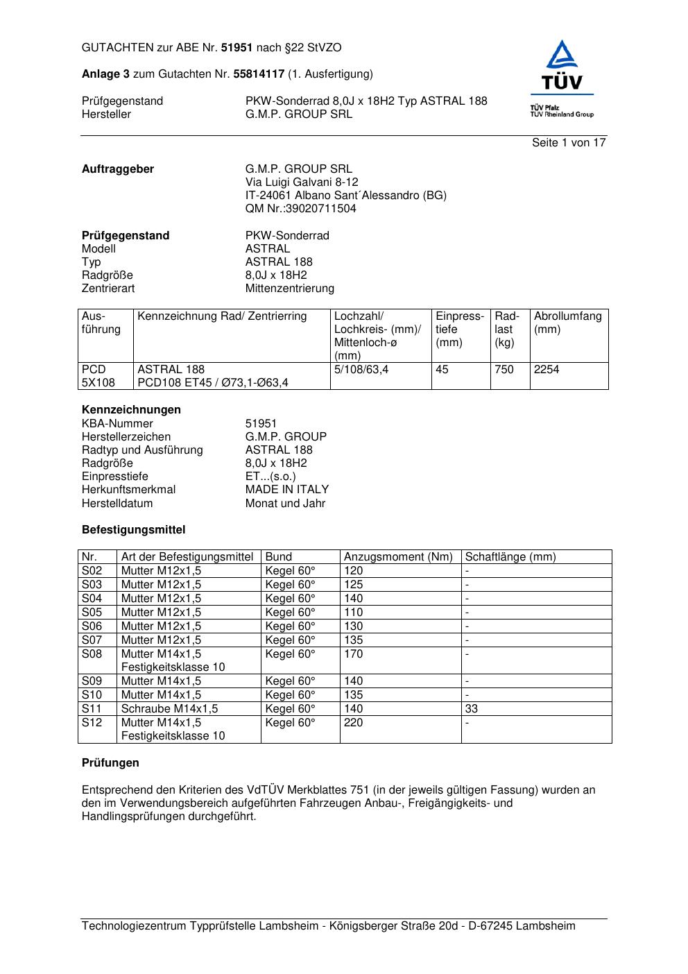 Dieses Gutachten (abe) bezieht sich auf die Alufelge G.M.P. ASTRAL 188 in der Ausführung ET 0, Mittenloch 0 mm (KBA 51951). Im PDF findest du typischerweise zulässige Reifengrößen, Auflagen/Anbauhinweise und – je nach Dokument – Hinweise zur Eintragung.