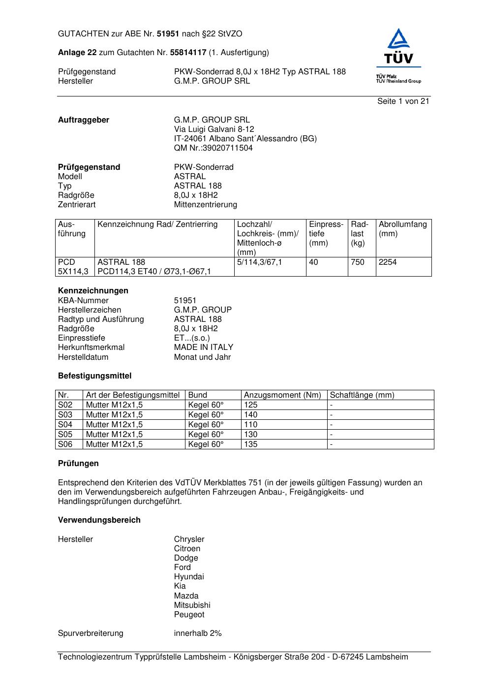 Dieses Gutachten (abe) bezieht sich auf die Alufelge G.M.P. ASTRAL 188 in der Ausführung ET 0, Mittenloch 0 mm (KBA 51951). Im PDF findest du typischerweise zulässige Reifengrößen, Auflagen/Anbauhinweise und – je nach Dokument – Hinweise zur Eintragung.