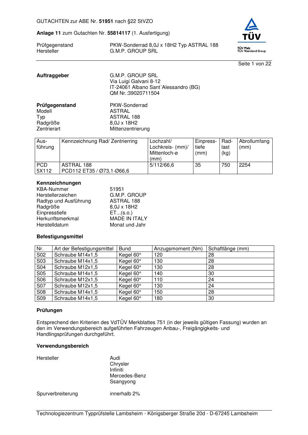 Felgengutachten / abe für Alufelgen G.M.P. ASTRAL 188 (ET 0, Mittenloch 0 mm) mit KBA 51951 (Zertifikatsnummer 51951). Hier kostenlos als PDF herunterladen. Der Download-Link ist 24 Stunden gültig und kann bis zu zwei Mal verwendet werden.