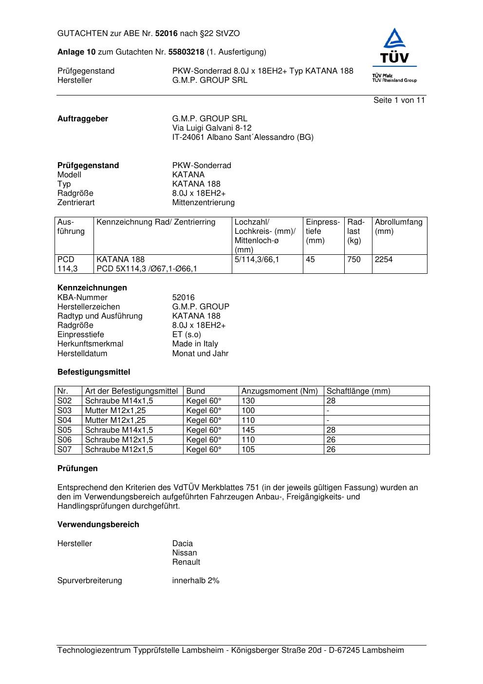 Felgengutachten / abe für Alufelgen G.M.P. KATANA 188 (ET 0, Mittenloch 0 mm) mit KBA 52016 (Zertifikatsnummer 52016). Hier kostenlos als PDF herunterladen. Der Download-Link ist 24 Stunden gültig und kann bis zu zwei Mal verwendet werden.