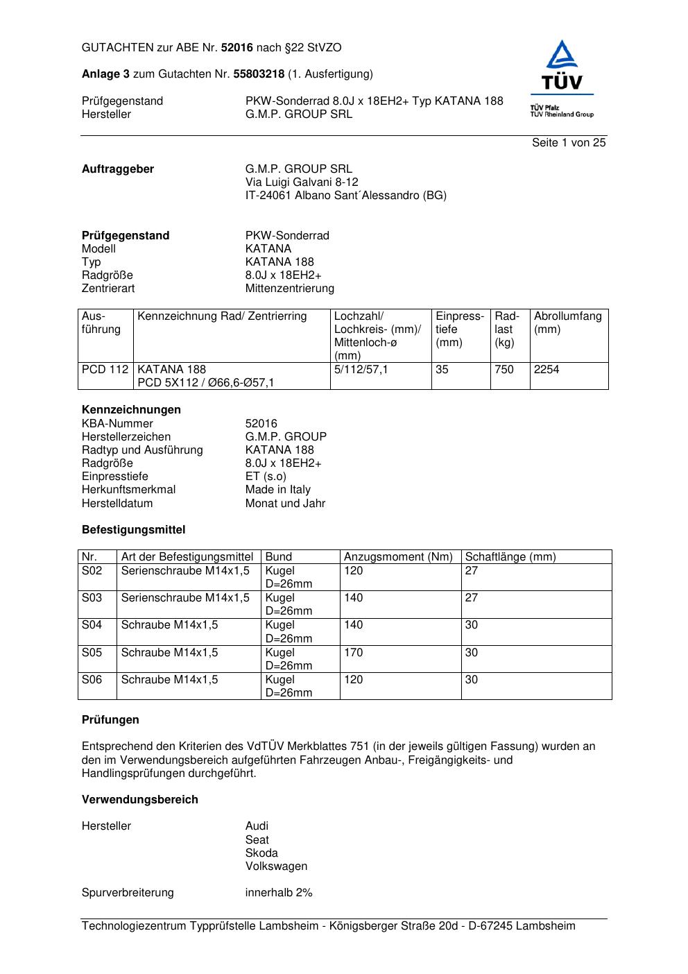 Felgengutachten / abe für Alufelgen G.M.P. KATANA 188 (ET 0, Mittenloch 0 mm) mit KBA 52016 (Zertifikatsnummer 52016). Hier kostenlos als PDF herunterladen. Der Download-Link ist 24 Stunden gültig und kann bis zu zwei Mal verwendet werden.