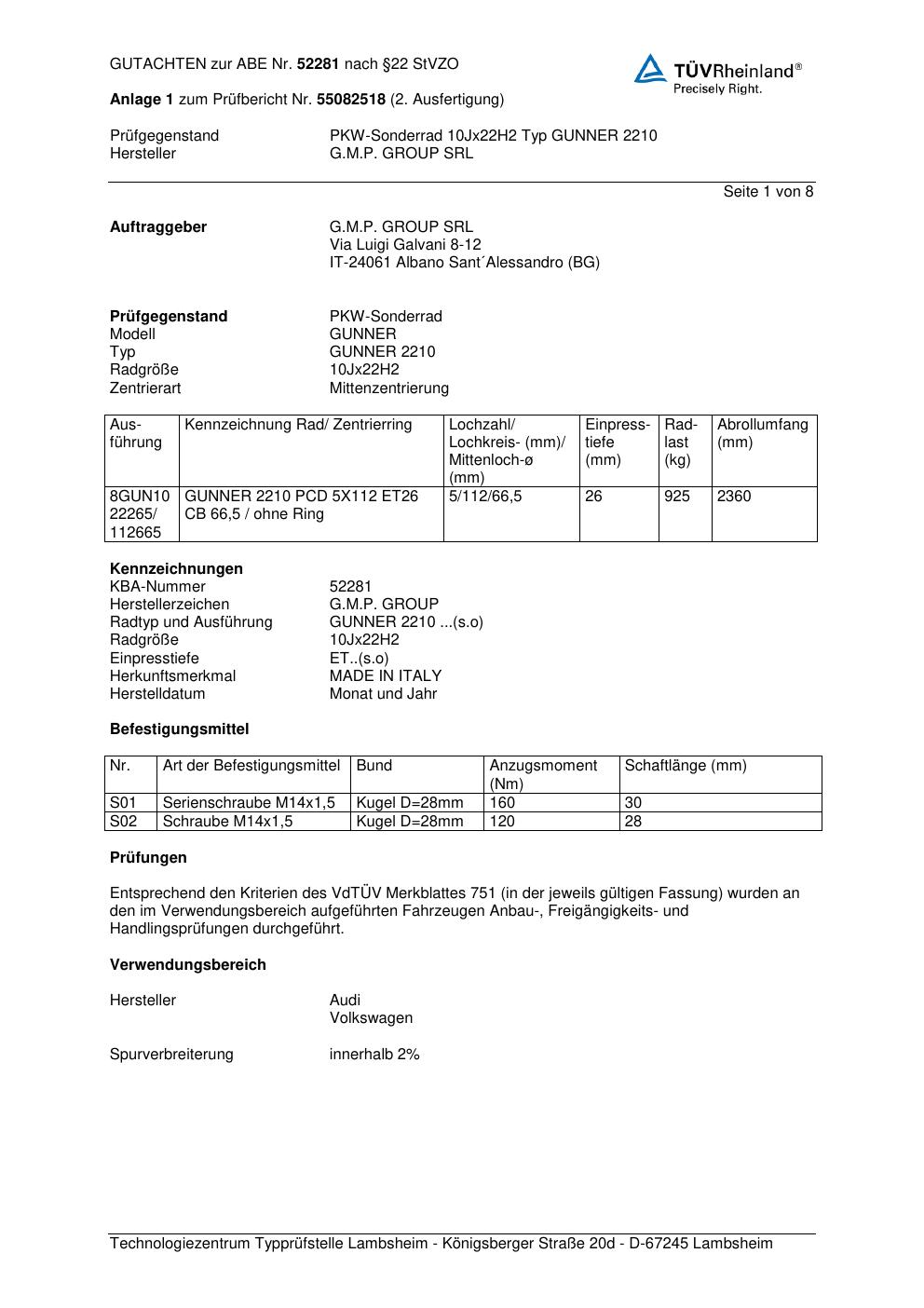 Felgengutachten / abe für Alufelgen G.M.P. GUNNER 22 10 (ET 0, Mittenloch 0 mm) mit KBA 52281 (Zertifikatsnummer 52281). Hier kostenlos als PDF herunterladen. Der Download-Link ist 24 Stunden gültig und kann bis zu zwei Mal verwendet werden.