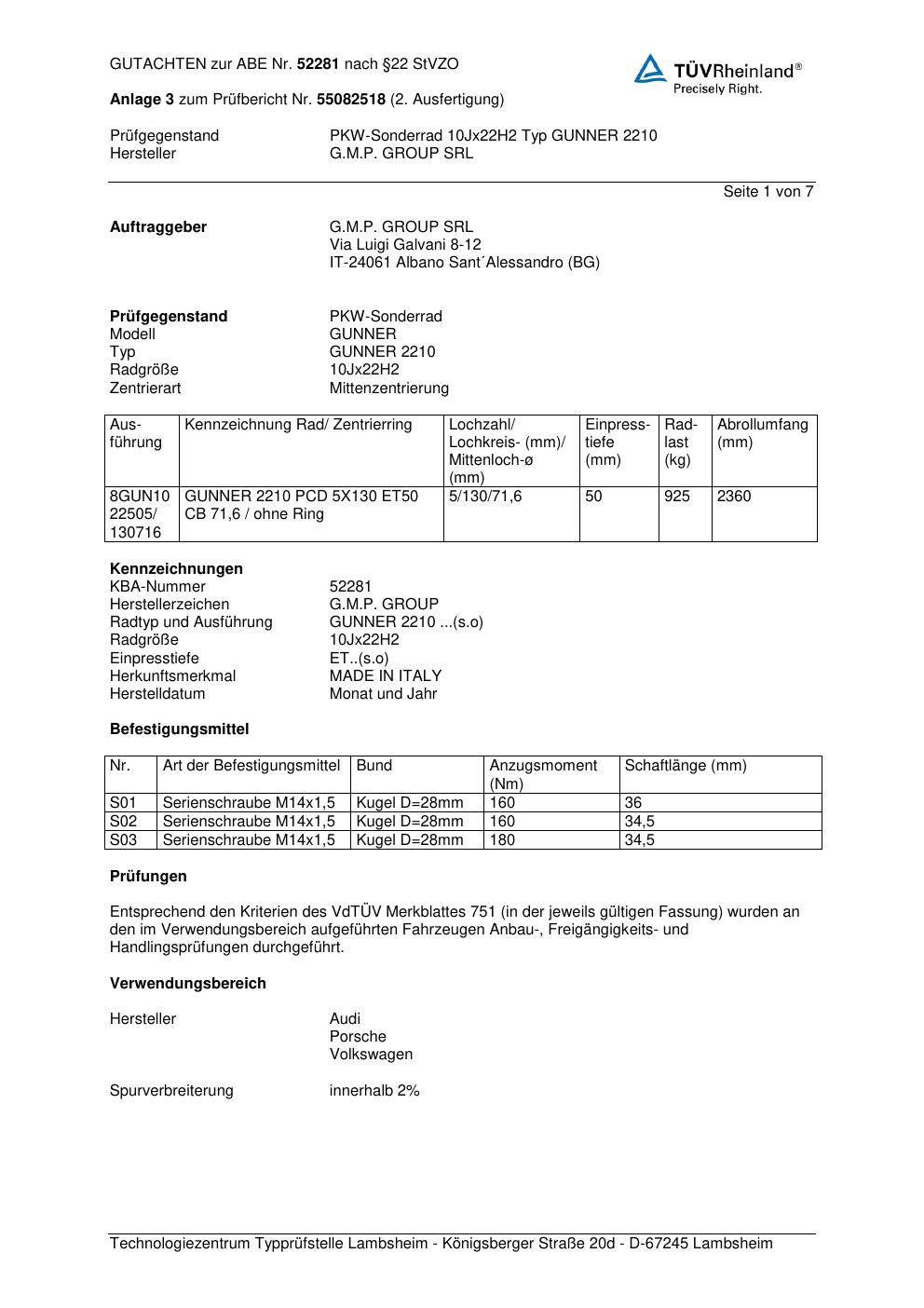 Felgengutachten / abe für Alufelgen G.M.P. GUNNER 22 10 (ET 0, Mittenloch 0 mm) mit KBA 52281 (Zertifikatsnummer 52281). Hier kostenlos als PDF herunterladen. Der Download-Link ist 24 Stunden gültig und kann bis zu zwei Mal verwendet werden.