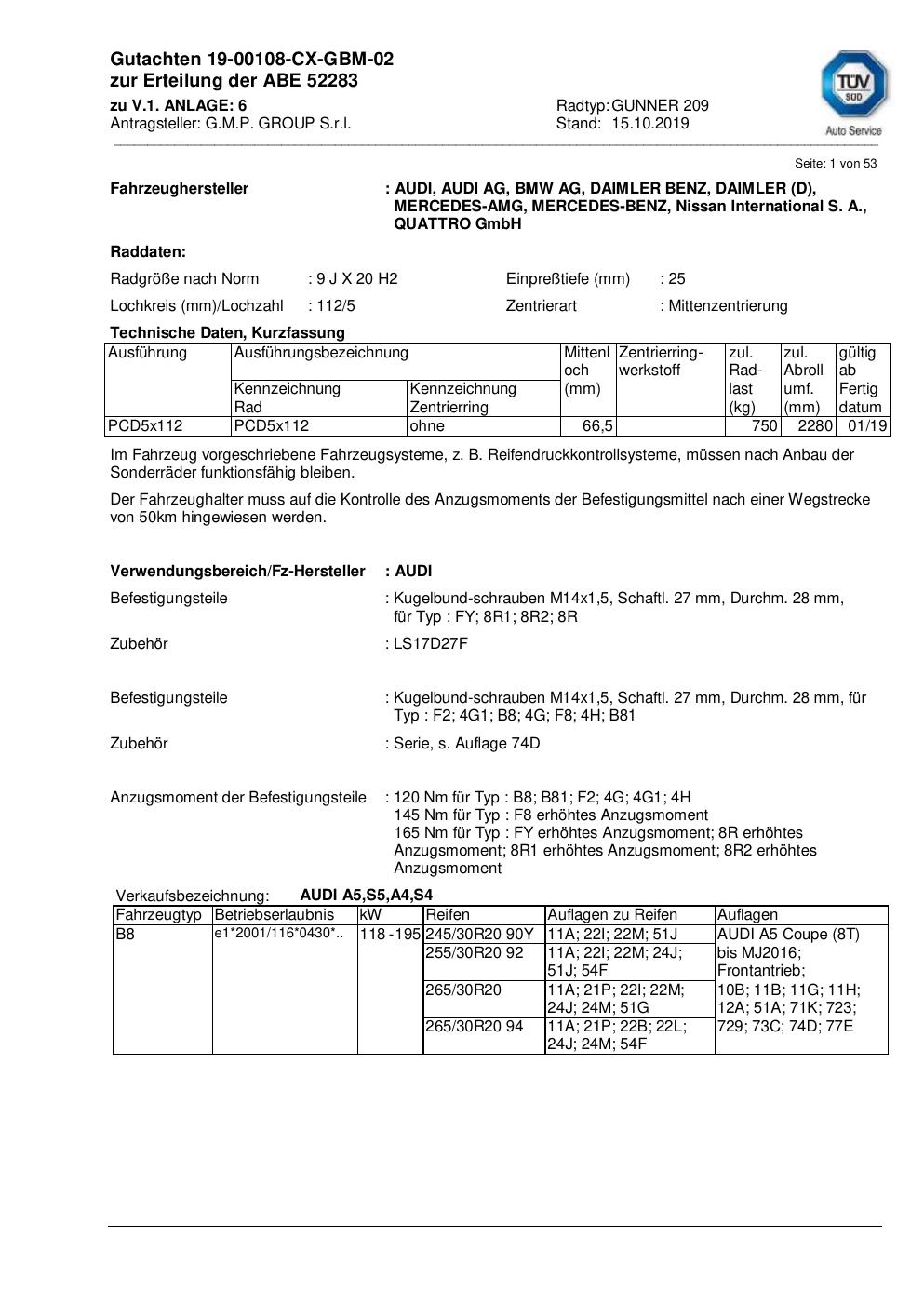 Dieses Gutachten (abe) bezieht sich auf die Alufelge G.M.P. GROUP S.r.l. GUNNER 209 in der Ausführung ET 0, Mittenloch 0 mm (KBA 52283). Im PDF findest du typischerweise zulässige Reifengrößen, Auflagen/Anbauhinweise und – je nach Dokument – Hinweise zur Eintragung.
