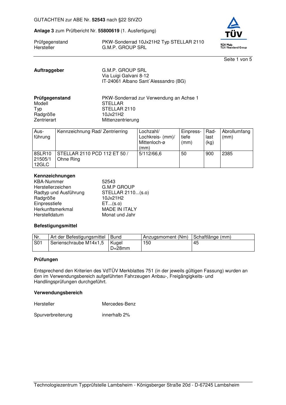 Felgengutachten / abe für Alufelgen G.M.P. STELLAR 2110 (ET 0, Mittenloch 0 mm) mit KBA 52543 (Zertifikatsnummer 52543). Hier kostenlos als PDF herunterladen. Der Download-Link ist 24 Stunden gültig und kann bis zu zwei Mal verwendet werden.