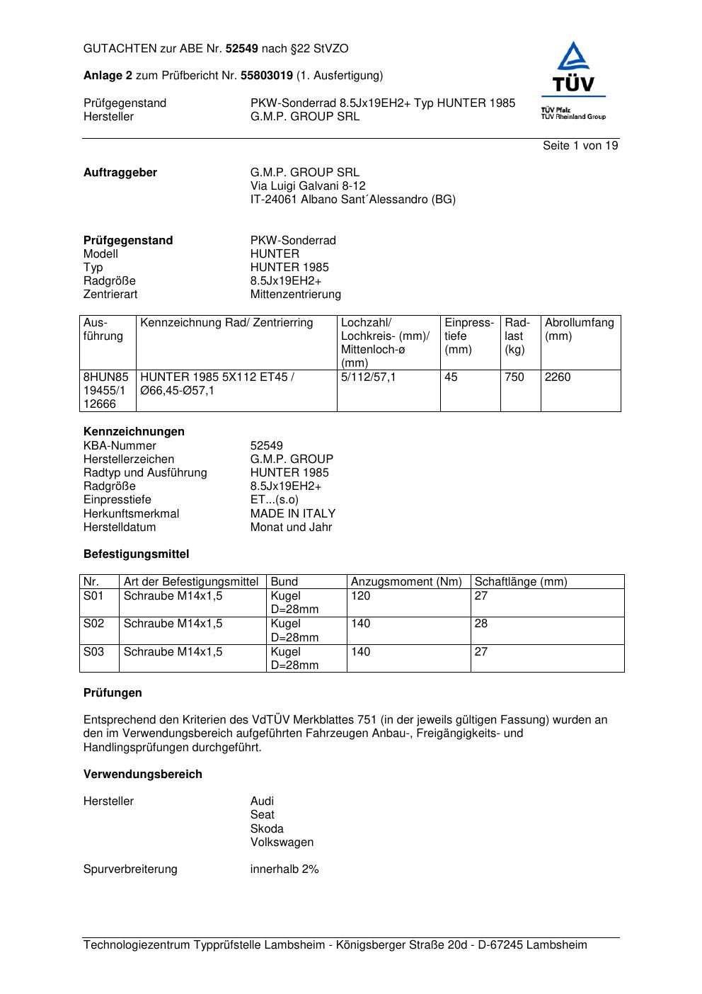 Felgengutachten / abe für Alufelgen G.M.P. HUNTER 1985 (ET 0, Mittenloch 0 mm) mit KBA 52549 (Zertifikatsnummer 52549). Hier kostenlos als PDF herunterladen. Der Download-Link ist 24 Stunden gültig und kann bis zu zwei Mal verwendet werden.