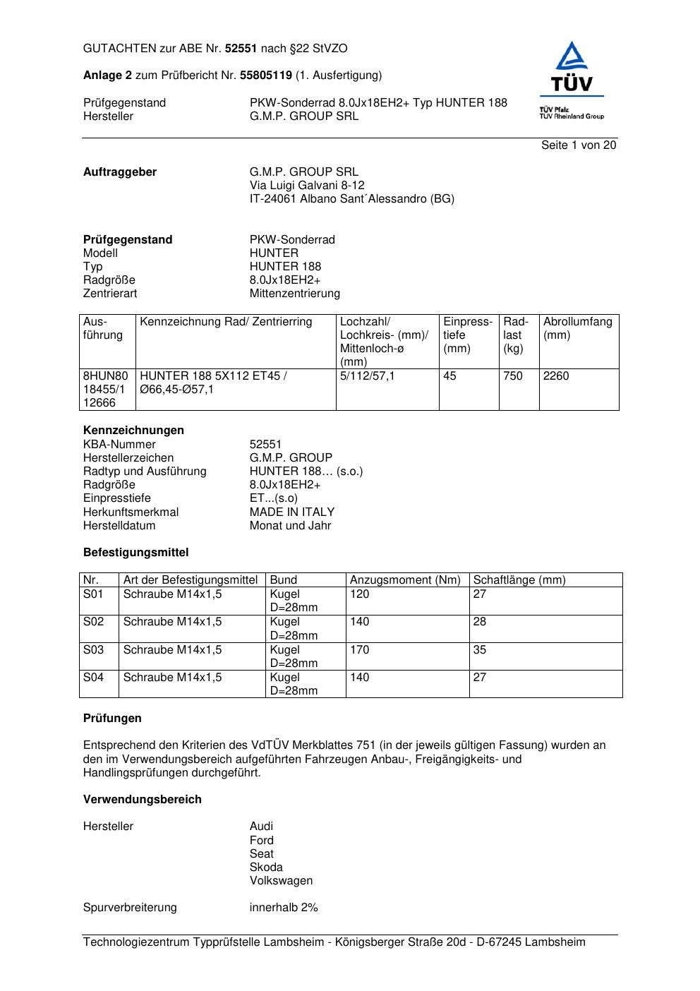 Felgengutachten / abe für Alufelgen G.M.P. HUNTER 188 (ET 0, Mittenloch 0 mm) mit KBA 52551 (Zertifikatsnummer 52551). Hier kostenlos als PDF herunterladen. Der Download-Link ist 24 Stunden gültig und kann bis zu zwei Mal verwendet werden.