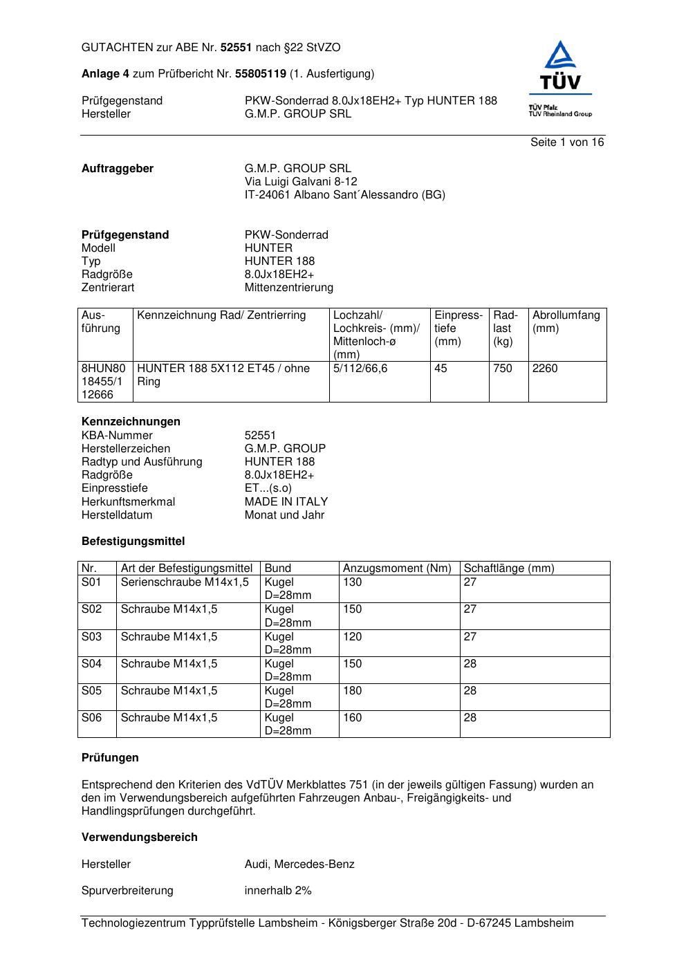 Felgengutachten / abe für Alufelgen G.M.P. HUNTER 188 (ET 0, Mittenloch 0 mm) mit KBA 52551 (Zertifikatsnummer 52551). Hier kostenlos als PDF herunterladen. Der Download-Link ist 24 Stunden gültig und kann bis zu zwei Mal verwendet werden.