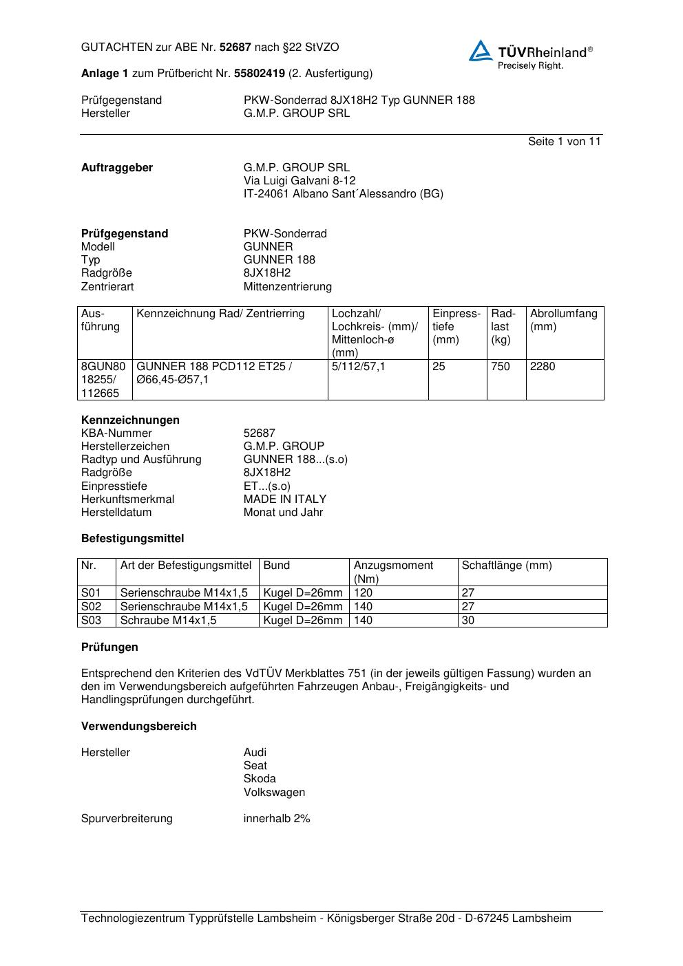 Felgengutachten / abe für Alufelgen G.M.P. GUNNER 188 (ET 0, Mittenloch 0 mm) mit KBA 52687 (Zertifikatsnummer 52687). Hier kostenlos als PDF herunterladen. Der Download-Link ist 24 Stunden gültig und kann bis zu zwei Mal verwendet werden.