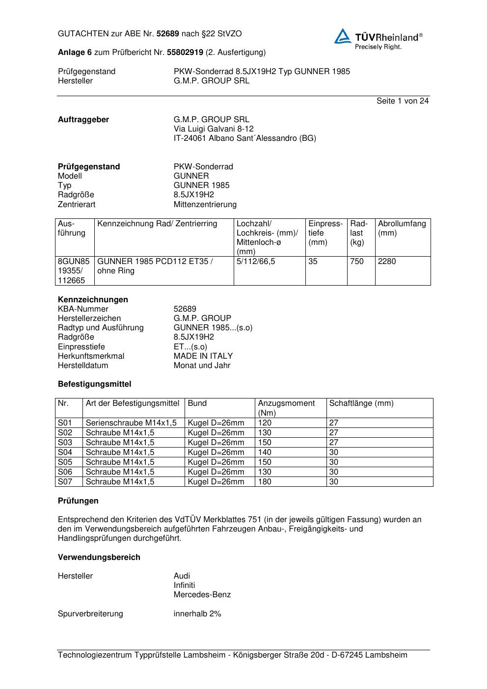Felgengutachten / abe für Alufelgen G.M.P. GUNNER 1985 (ET 0, Mittenloch 0 mm) mit KBA 52689 (Zertifikatsnummer 52689). Hier kostenlos als PDF herunterladen. Der Download-Link ist 24 Stunden gültig und kann bis zu zwei Mal verwendet werden.