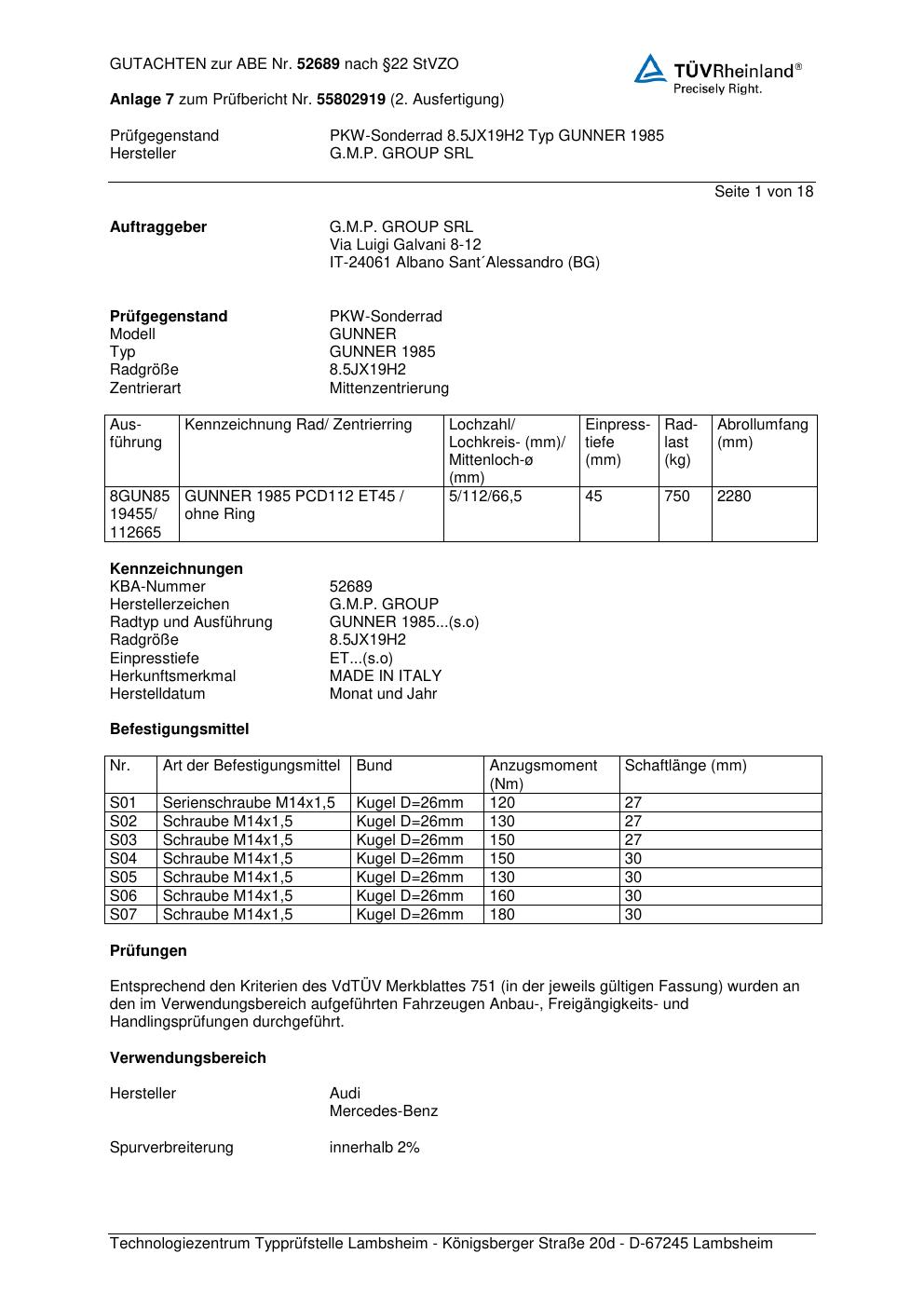 Felgengutachten / abe für Alufelgen G.M.P. GUNNER 1 985 (ET 0, Mittenloch 0 mm) mit KBA 52689 (Zertifikatsnummer 52689). Hier kostenlos als PDF herunterladen. Der Download-Link ist 24 Stunden gültig und kann bis zu zwei Mal verwendet werden.