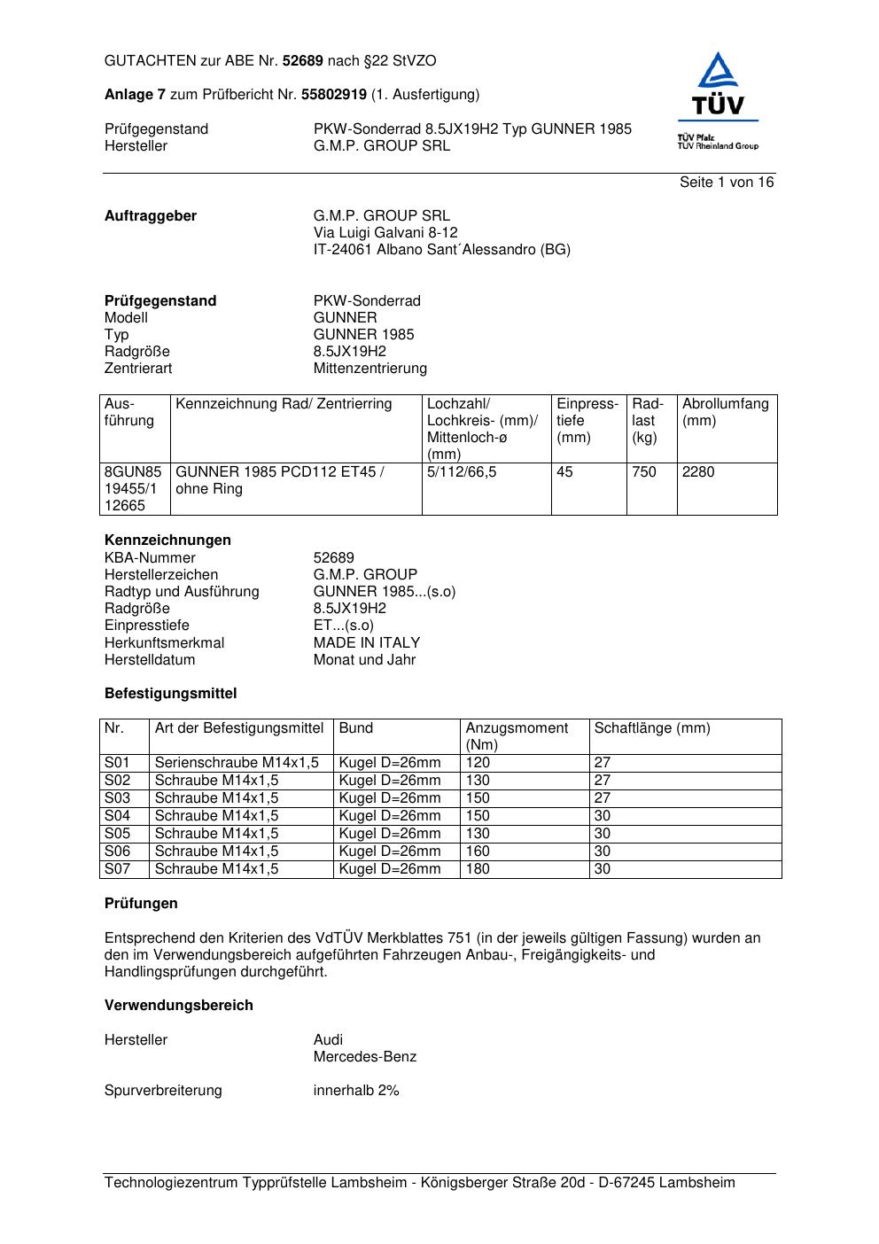 Felgengutachten / abe für Alufelgen G.M.P. GUNNER 1 985 (ET 0, Mittenloch 0 mm) mit KBA 52689 (Zertifikatsnummer 52689). Hier kostenlos als PDF herunterladen. Der Download-Link ist 24 Stunden gültig und kann bis zu zwei Mal verwendet werden.