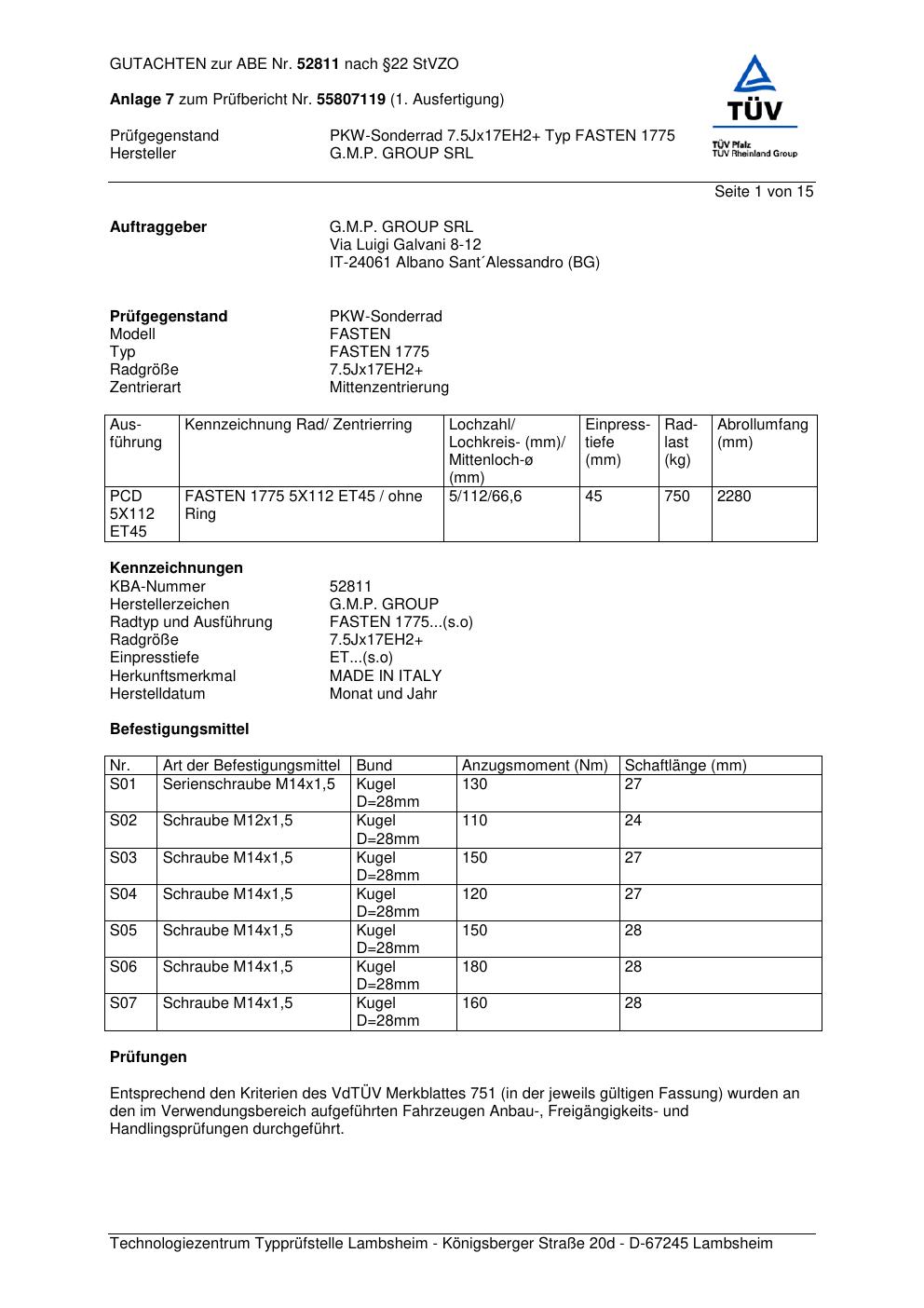 Felgengutachten / abe für Alufelgen G.M.P. FASTEN 1775 (ET 0, Mittenloch 0 mm) mit KBA 52811 (Zertifikatsnummer 52811). Hier kostenlos als PDF herunterladen. Der Download-Link ist 24 Stunden gültig und kann bis zu zwei Mal verwendet werden.