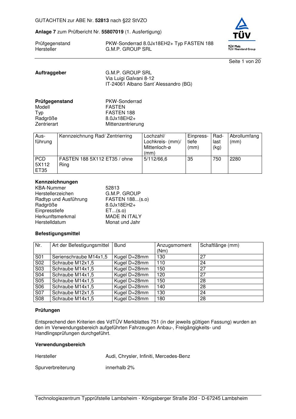 Felgengutachten / abe für Alufelgen G.M.P. FASTEN 188 (ET 0, Mittenloch 0 mm) mit KBA 52813 (Zertifikatsnummer 52813). Hier kostenlos als PDF herunterladen. Der Download-Link ist 24 Stunden gültig und kann bis zu zwei Mal verwendet werden.