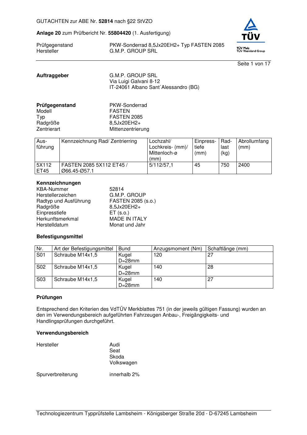 Felgengutachten / abe für Alufelgen G.M.P. FASTEN 2085 (ET 0, Mittenloch 0 mm) mit KBA 52814 (Zertifikatsnummer 52814). Hier kostenlos als PDF herunterladen. Der Download-Link ist 24 Stunden gültig und kann bis zu zwei Mal verwendet werden.