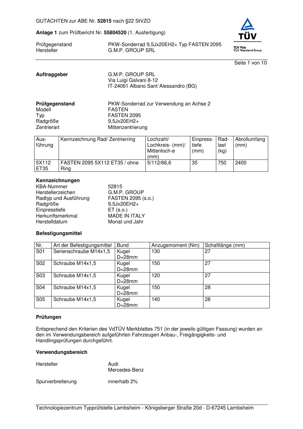 Felgengutachten / abe für Alufelgen G.M.P. FASTEN 2095 (ET 0, Mittenloch 0 mm) mit KBA 52815 (Zertifikatsnummer 52815). Hier kostenlos als PDF herunterladen. Der Download-Link ist 24 Stunden gültig und kann bis zu zwei Mal verwendet werden.