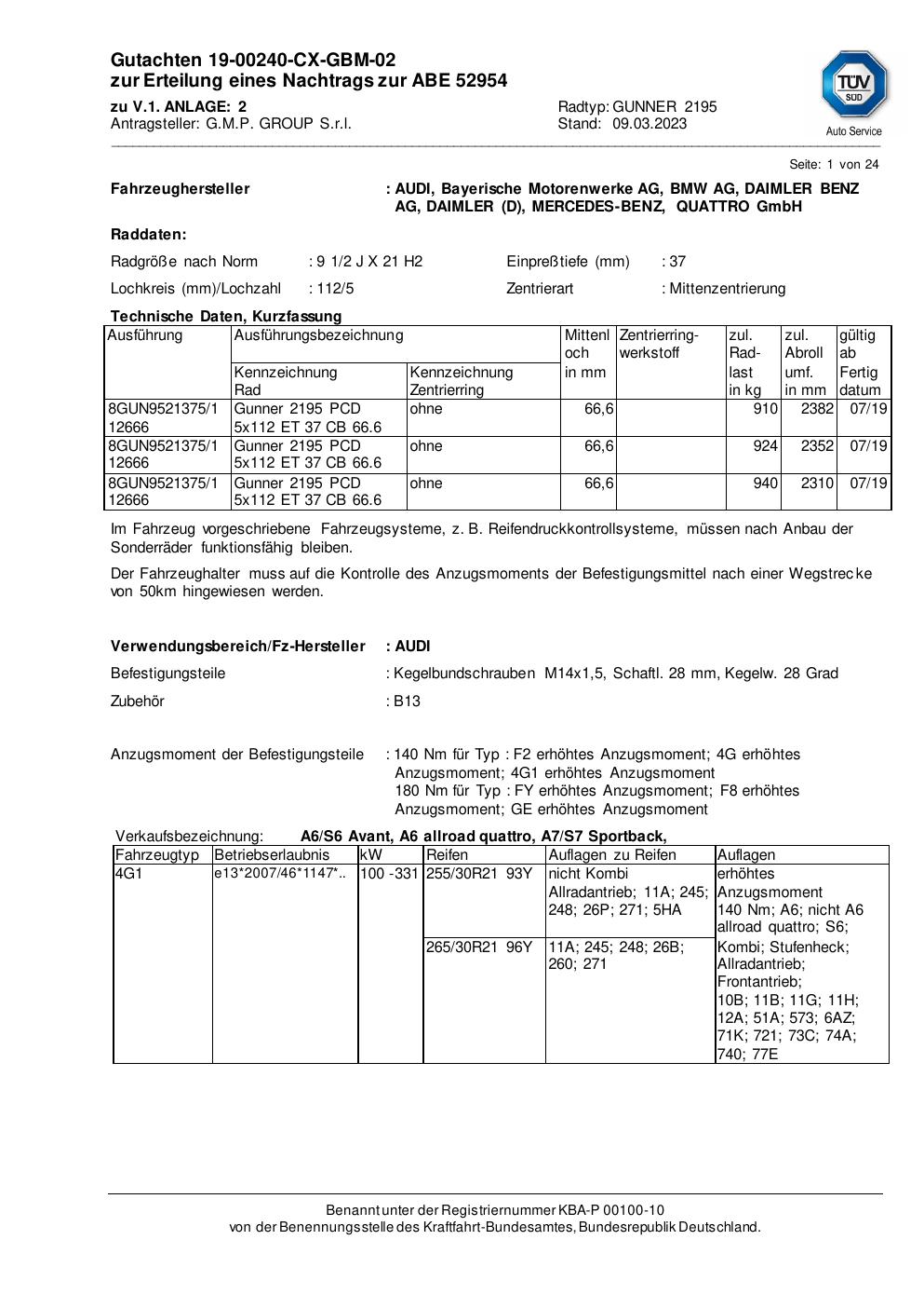 Dieses Gutachten (abe) bezieht sich auf die Alufelge G.M.P. GROUP S.r.l. GUNNER 2195 in der Ausführung ET 0, Mittenloch 0 mm (KBA 52954). Im PDF findest du typischerweise zulässige Reifengrößen, Auflagen/Anbauhinweise und – je nach Dokument – Hinweise zur Eintragung.