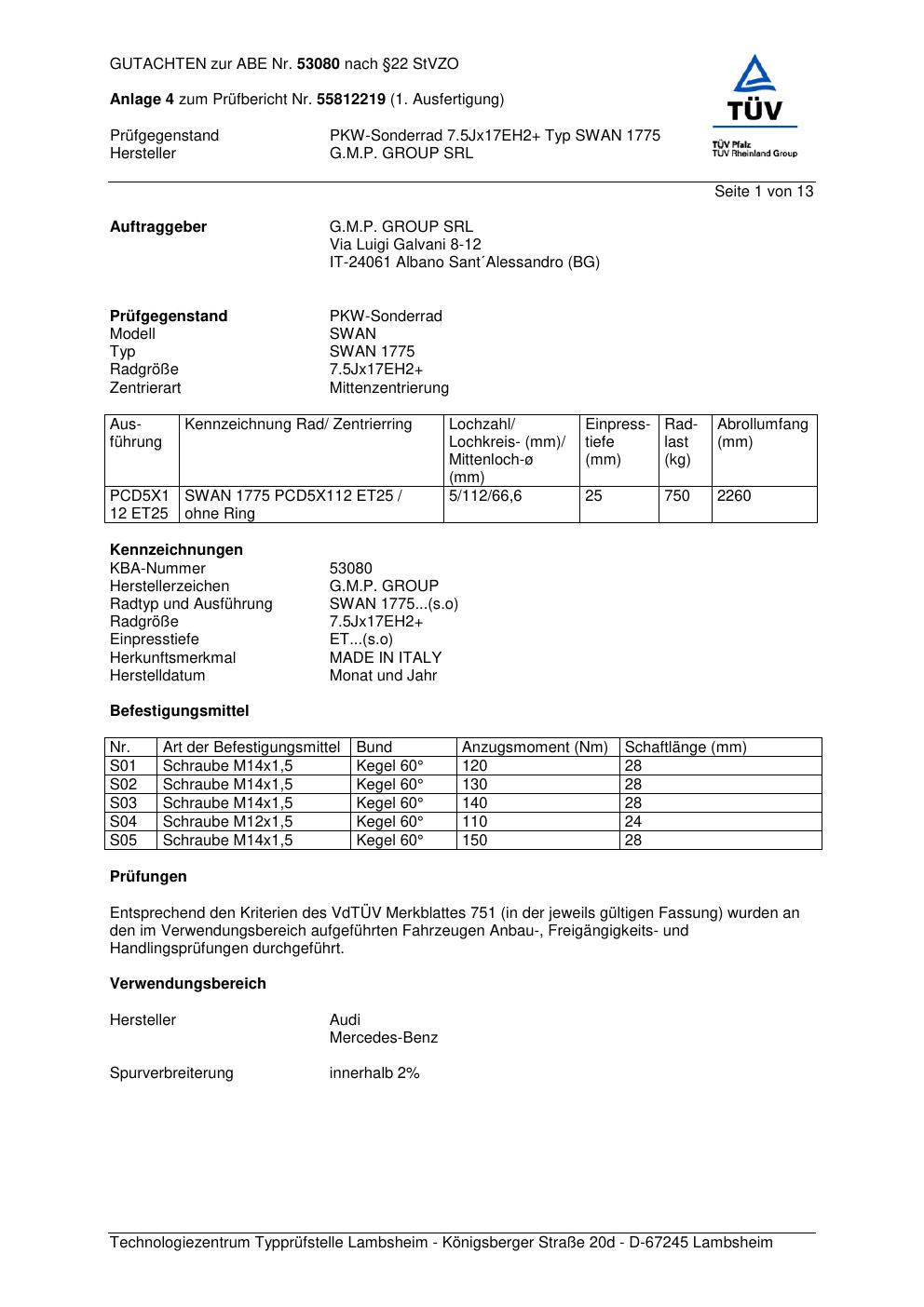 Dieses Gutachten (abe) bezieht sich auf die Alufelge G.M.P. SWAN 1775 in der Ausführung ET 0, Mittenloch 0 mm (KBA 53080). Im PDF findest du typischerweise zulässige Reifengrößen, Auflagen/Anbauhinweise und – je nach Dokument – Hinweise zur Eintragung.