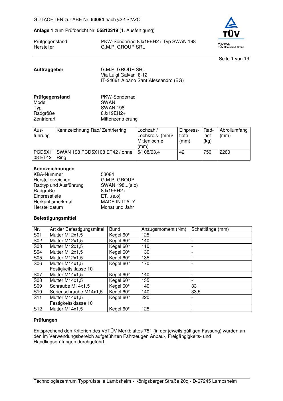 Dieses Gutachten (abe) bezieht sich auf die Alufelge G.M.P. SWAN 198 in der Ausführung ET 0, Mittenloch 0 mm (KBA 53084). Im PDF findest du typischerweise zulässige Reifengrößen, Auflagen/Anbauhinweise und – je nach Dokument – Hinweise zur Eintragung.