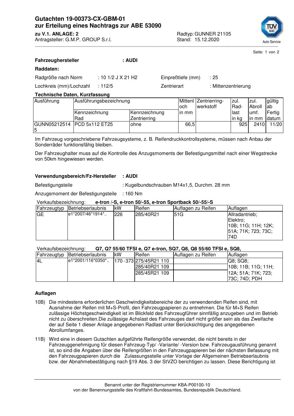 Felgengutachten / abe für Alufelgen G.M.P. GROUP S.r.l. GUNNER 21105 (ET 0, Mittenloch 0 mm) mit KBA 53090 (Zertifikatsnummer 53090). Hier kostenlos als PDF herunterladen. Der Download-Link ist 24 Stunden gültig und kann bis zu zwei Mal verwendet werden.
