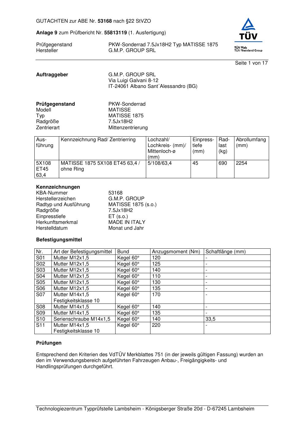 Dieses Gutachten (abe) bezieht sich auf die Alufelge G.M.P. MATISSE 1875 in der Ausführung ET 0, Mittenloch 0 mm (KBA 53168). Im PDF findest du typischerweise zulässige Reifengrößen, Auflagen/Anbauhinweise und – je nach Dokument – Hinweise zur Eintragung.