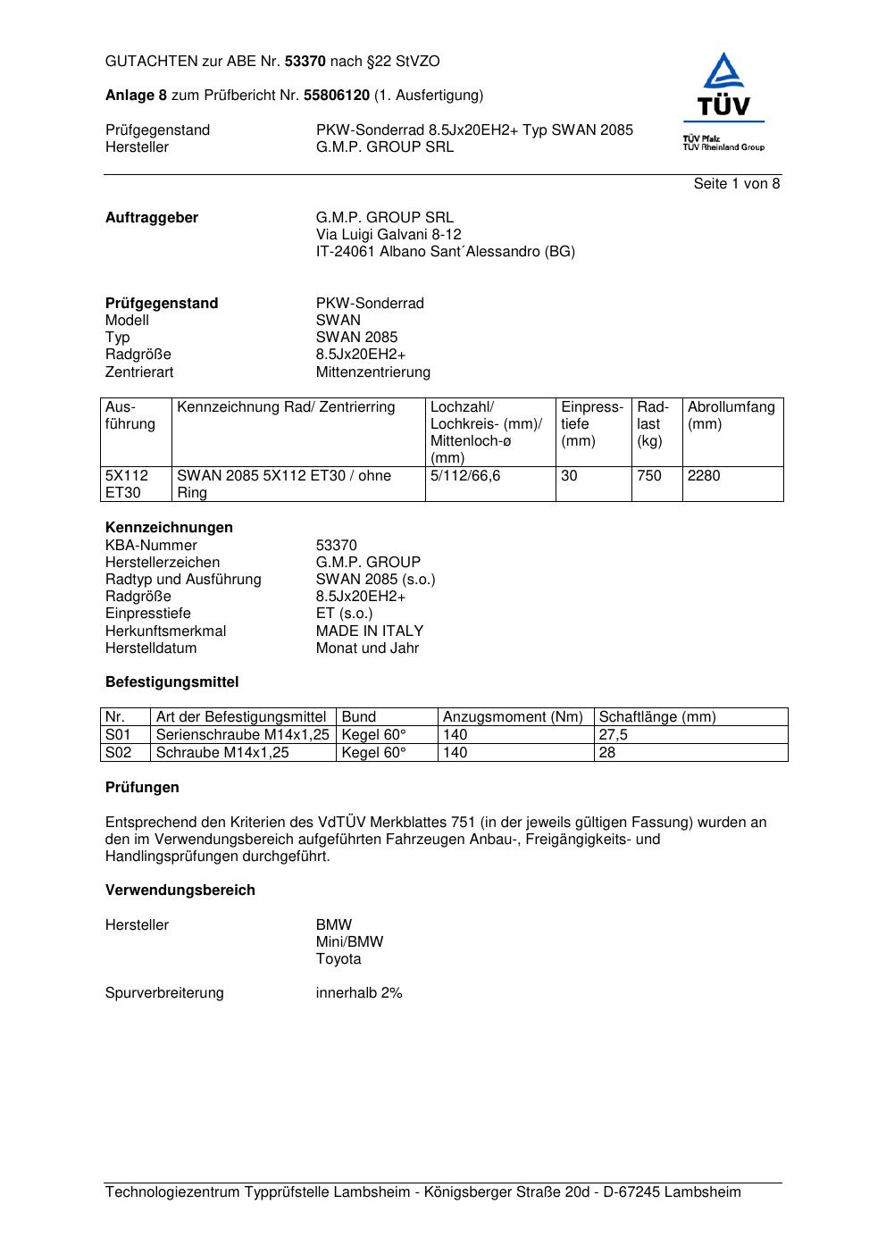 Dieses Gutachten (abe) bezieht sich auf die Alufelge G.M.P. SWAN 2 085 in der Ausführung ET 0, Mittenloch 0 mm (KBA 53370). Im PDF findest du typischerweise zulässige Reifengrößen, Auflagen/Anbauhinweise und – je nach Dokument – Hinweise zur Eintragung.