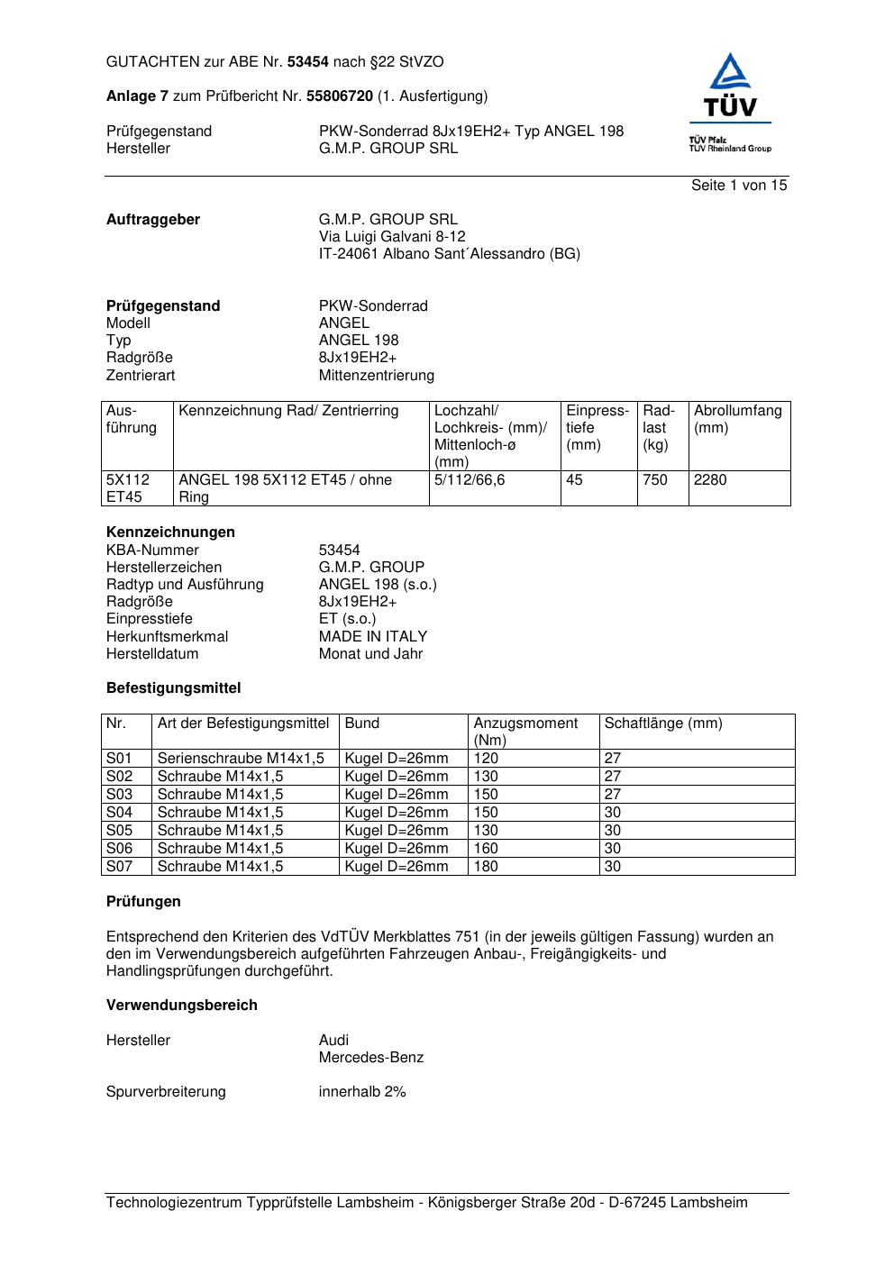 Dieses Gutachten (abe) bezieht sich auf die Alufelge G.M.P. ANGEL 19 8 in der Ausführung ET 0, Mittenloch 0 mm (KBA 53454). Im PDF findest du typischerweise zulässige Reifengrößen, Auflagen/Anbauhinweise und – je nach Dokument – Hinweise zur Eintragung.