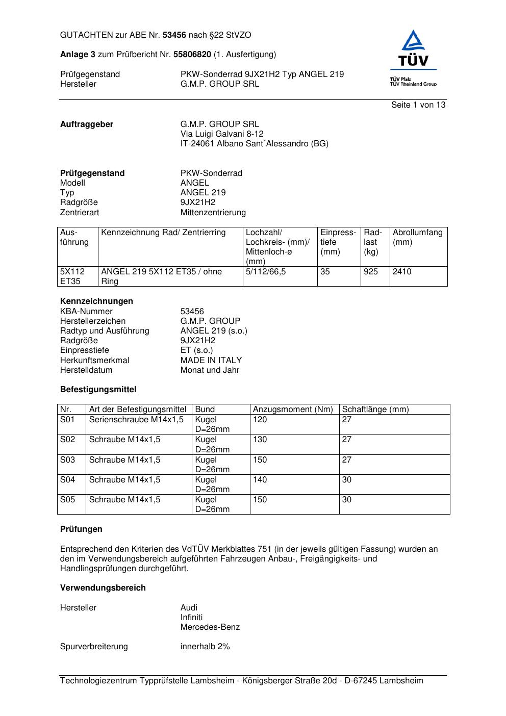 Dieses Gutachten (abe) bezieht sich auf die Alufelge G.M.P. ANGEL 219 in der Ausführung ET 0, Mittenloch 0 mm (KBA 53456). Im PDF findest du typischerweise zulässige Reifengrößen, Auflagen/Anbauhinweise und – je nach Dokument – Hinweise zur Eintragung.
