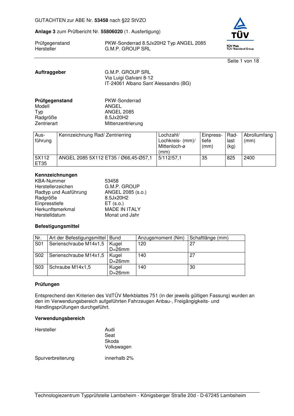 Felgengutachten / abe für Alufelgen G.M.P. ANGEL 20 85 (ET 0, Mittenloch 0 mm) mit KBA 53458 (Zertifikatsnummer 53458). Hier kostenlos als PDF herunterladen. Der Download-Link ist 24 Stunden gültig und kann bis zu zwei Mal verwendet werden.