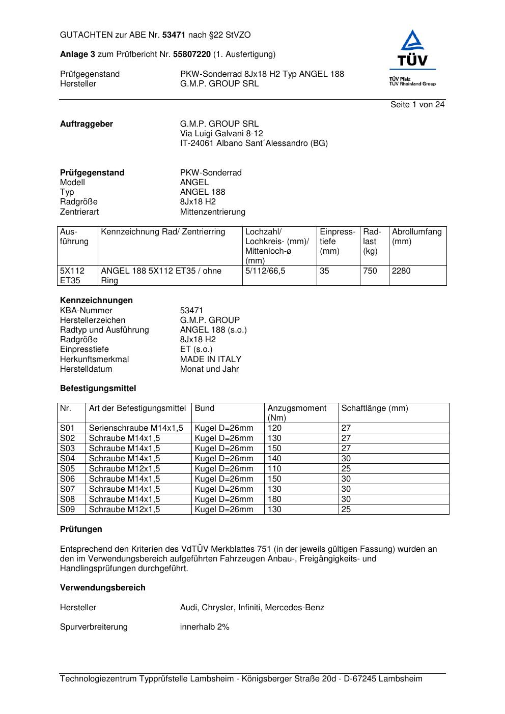 Dieses Gutachten (abe) bezieht sich auf die Alufelge G.M.P. ANGEL 188 in der Ausführung ET 0, Mittenloch 0 mm (KBA 53471). Im PDF findest du typischerweise zulässige Reifengrößen, Auflagen/Anbauhinweise und – je nach Dokument – Hinweise zur Eintragung.