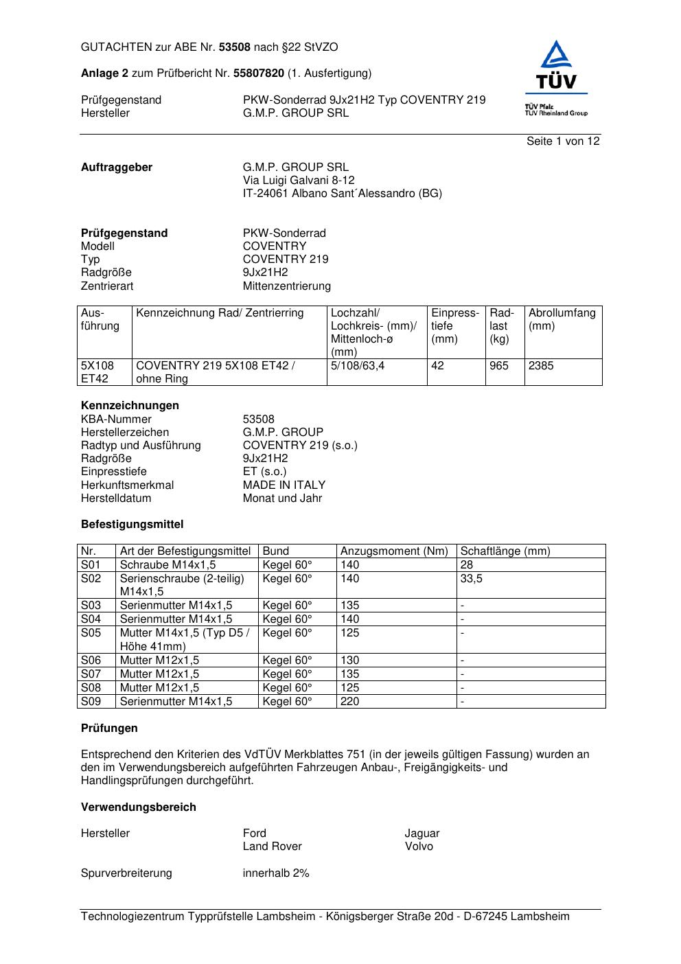 Felgengutachten / abe für Alufelgen G.M.P. COVENTRY 219 (ET 0, Mittenloch 0 mm) mit KBA 53508 (Zertifikatsnummer 53508). Hier kostenlos als PDF herunterladen. Der Download-Link ist 24 Stunden gültig und kann bis zu zwei Mal verwendet werden.