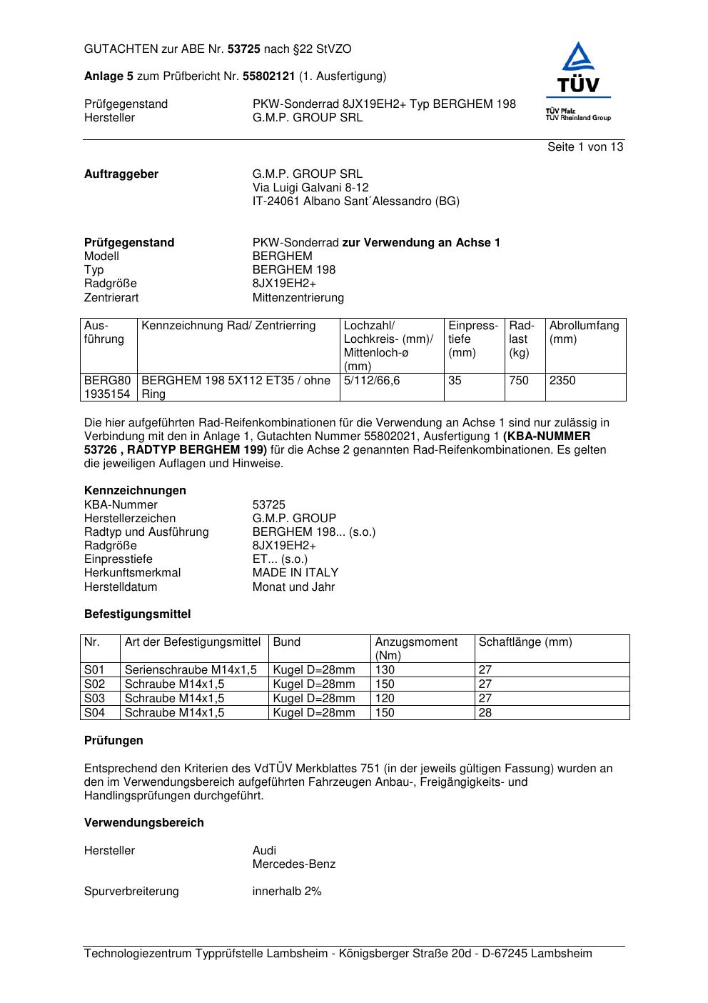 Dieses Gutachten (abe) bezieht sich auf die Alufelge G.M.P. BERGHEM 198 in der Ausführung ET 0, Mittenloch 0 mm (KBA 53725). Im PDF findest du typischerweise zulässige Reifengrößen, Auflagen/Anbauhinweise und – je nach Dokument – Hinweise zur Eintragung.