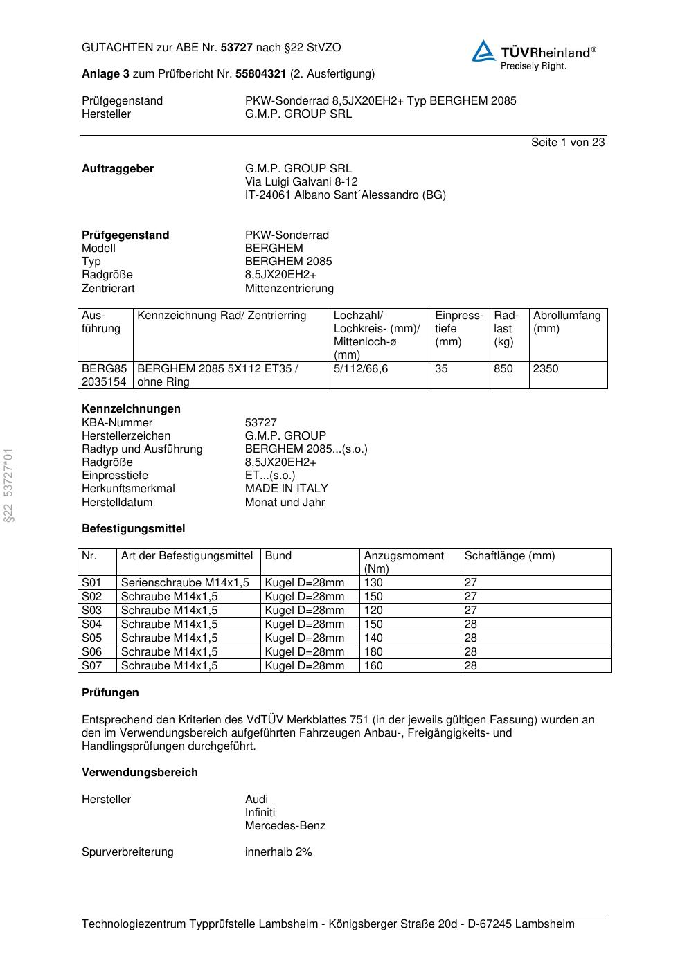 Felgengutachten / abe für Alufelgen G.M.P. BERGHE M 2085 (ET 0, Mittenloch 0 mm) mit KBA 53727 (Zertifikatsnummer 53727). Hier kostenlos als PDF herunterladen. Der Download-Link ist 24 Stunden gültig und kann bis zu zwei Mal verwendet werden.