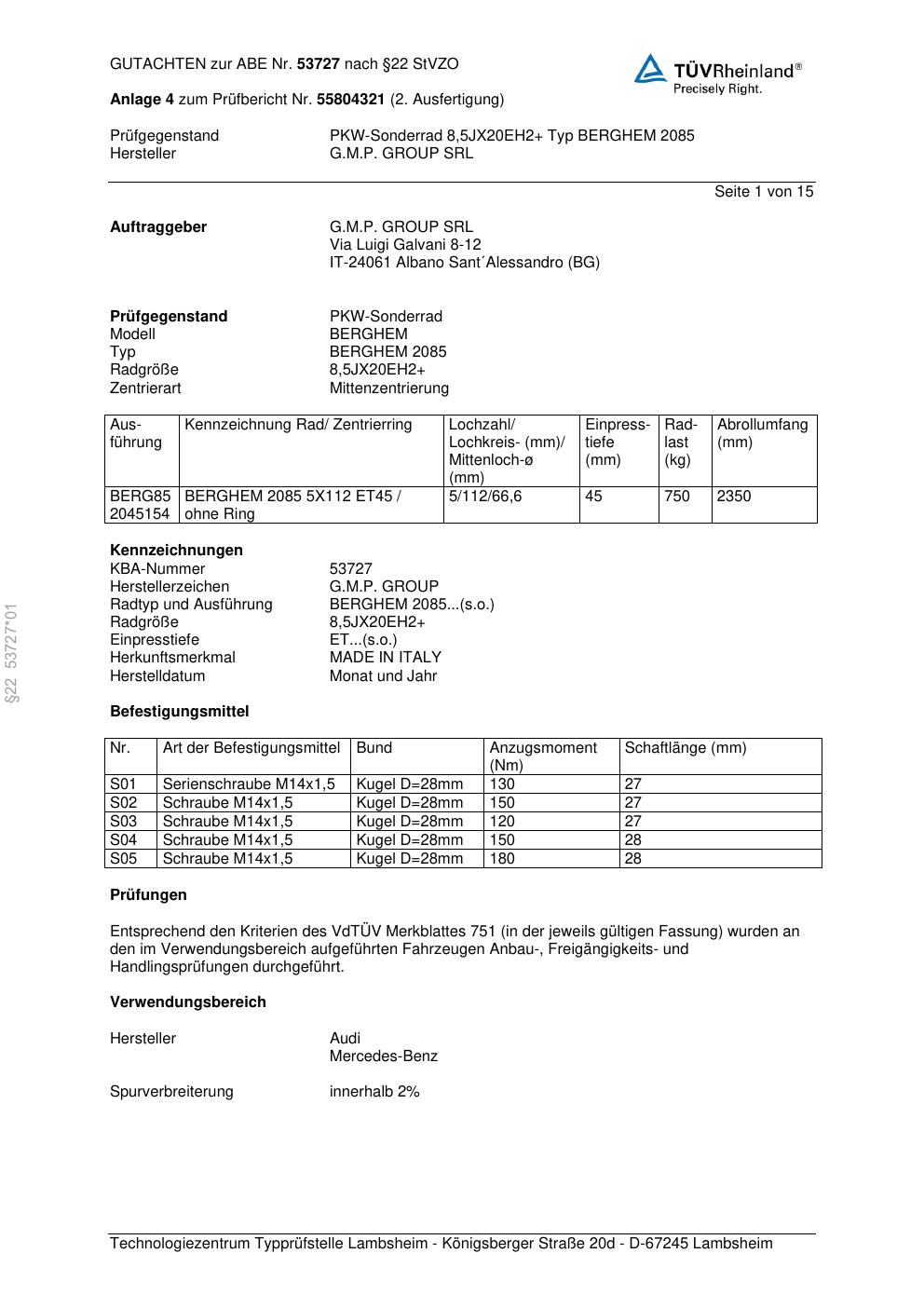 Dieses Gutachten (abe) bezieht sich auf die Alufelge G.M.P. BERGHEM 2085 in der Ausführung ET 0, Mittenloch 0 mm (KBA 53727). Im PDF findest du typischerweise zulässige Reifengrößen, Auflagen/Anbauhinweise und – je nach Dokument – Hinweise zur Eintragung.