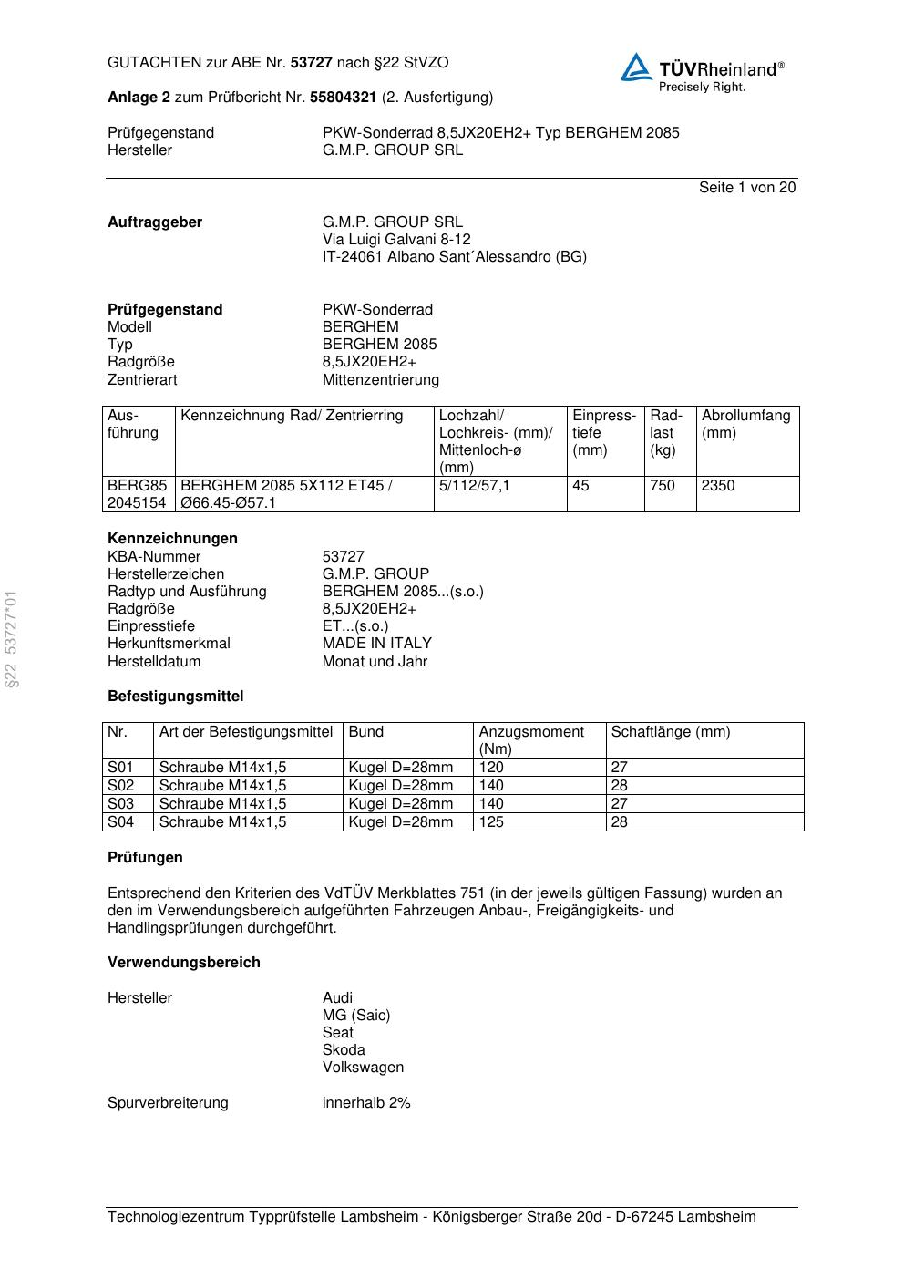 Dieses Gutachten (abe) bezieht sich auf die Alufelge G.M.P. BERGHE M 2085 in der Ausführung ET 0, Mittenloch 0 mm (KBA 53727). Im PDF findest du typischerweise zulässige Reifengrößen, Auflagen/Anbauhinweise und – je nach Dokument – Hinweise zur Eintragung.