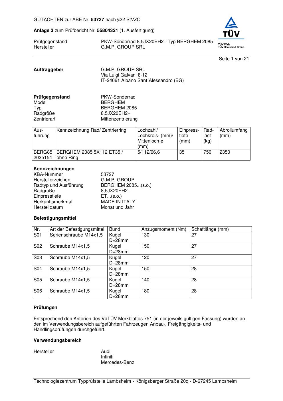 Felgengutachten / abe für Alufelgen G.M.P. BERGHE M 2085 (ET 0, Mittenloch 0 mm) mit KBA 53727 (Zertifikatsnummer 53727). Hier kostenlos als PDF herunterladen. Der Download-Link ist 24 Stunden gültig und kann bis zu zwei Mal verwendet werden.