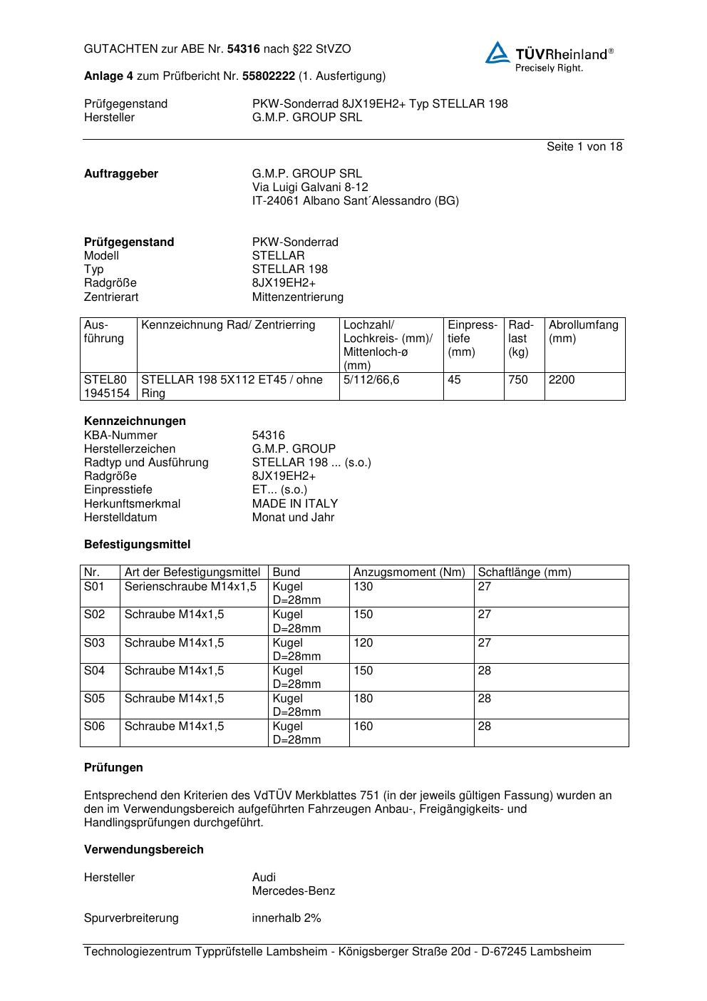 Dieses Gutachten (abe) bezieht sich auf die Alufelge G.M.P. GROUP SRL STELLAR 198 in der Ausführung ET 0, Mittenloch 0 mm (KBA 54316). Im PDF findest du typischerweise zulässige Reifengrößen, Auflagen/Anbauhinweise und – je nach Dokument – Hinweise zur Eintragung.