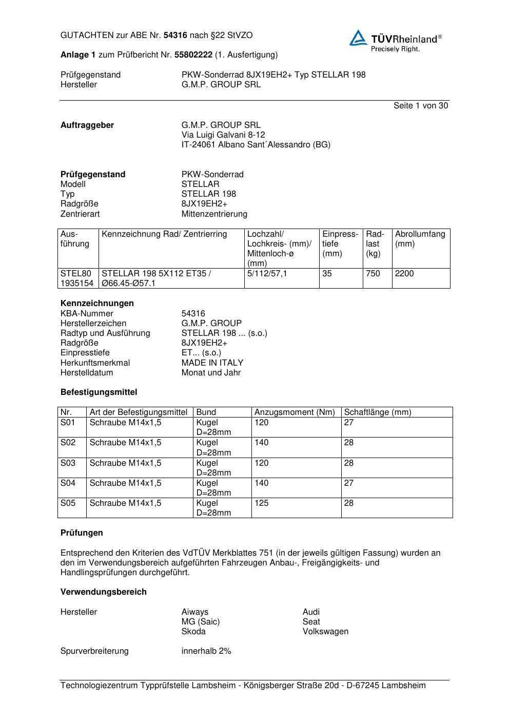 Dieses Gutachten (abe) bezieht sich auf die Alufelge G.M.P. GROUP SRL STELLAR 198 in der Ausführung ET 0, Mittenloch 0 mm (KBA 54316). Im PDF findest du typischerweise zulässige Reifengrößen, Auflagen/Anbauhinweise und – je nach Dokument – Hinweise zur Eintragung.